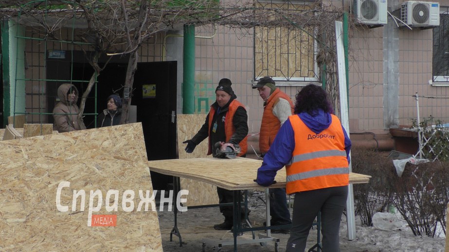 Тем временем, во дворе дома без перерывов работают спасатели, коммунальщики и представители общественных организаций. Ремонтные бригады замеряют окна и сразу забивают плитами OSB.