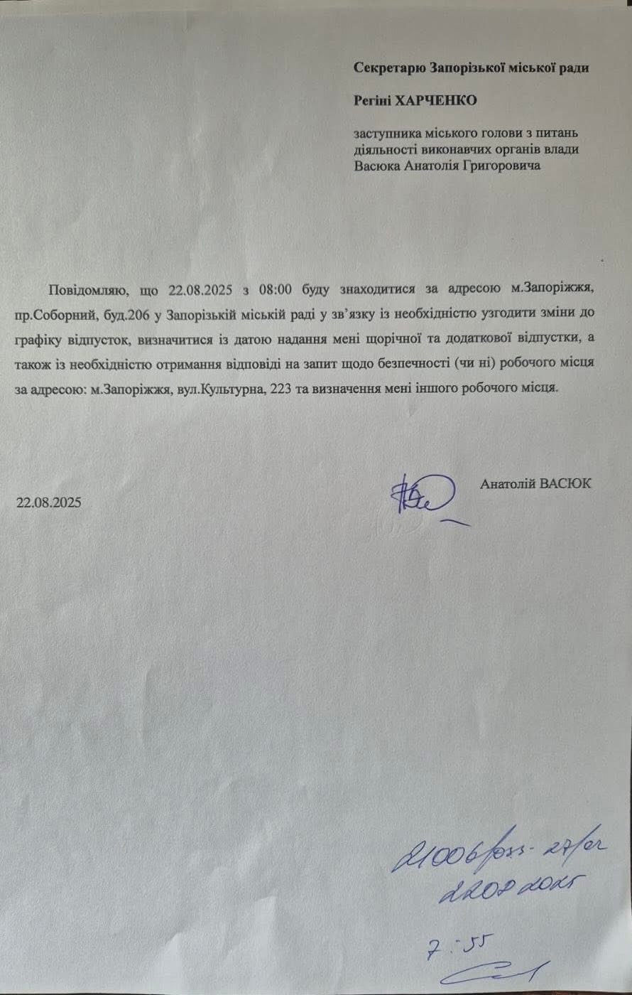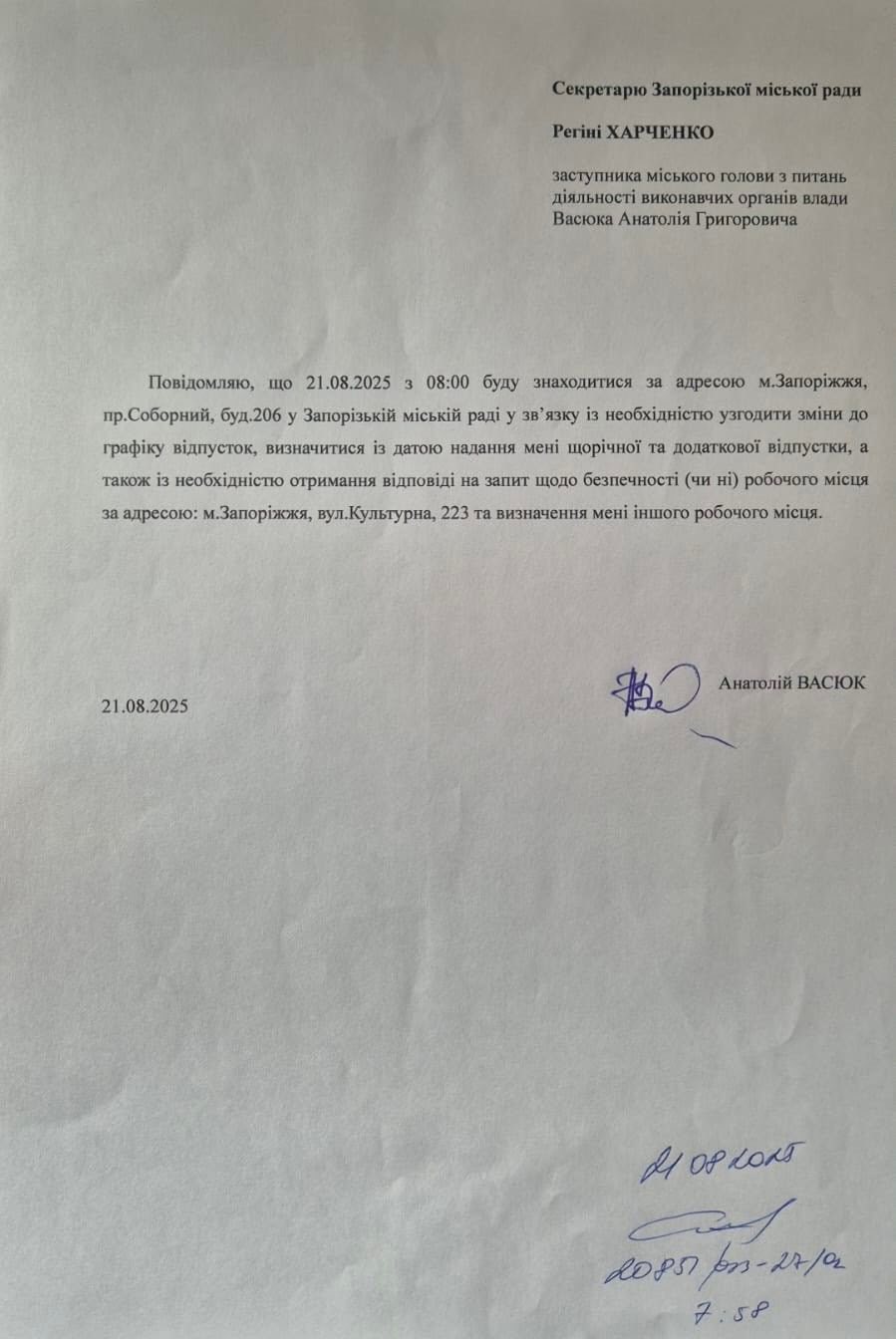 Вместе с тем сам Васюк саркастически назвал решение "юридическим шедевром". А бывший и.о. городского головы Запорожья Анатолий Куртев, при котором Васюк и был заместителем, обнародовал заявления последнего на имя нынешней и.о. городского головы Запорожья Регины Харченко, где Васюк предупреждает об отсутствии на рабочем месте 21 и 22 августа. В это время он якобы находился в здании Запорожского горсовета для "согласования графика отпусков" и определения ему другого рабочего места, поскольку предоставленным он был недоволен.