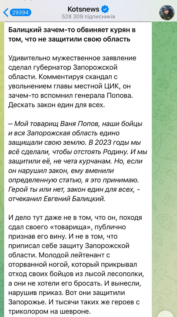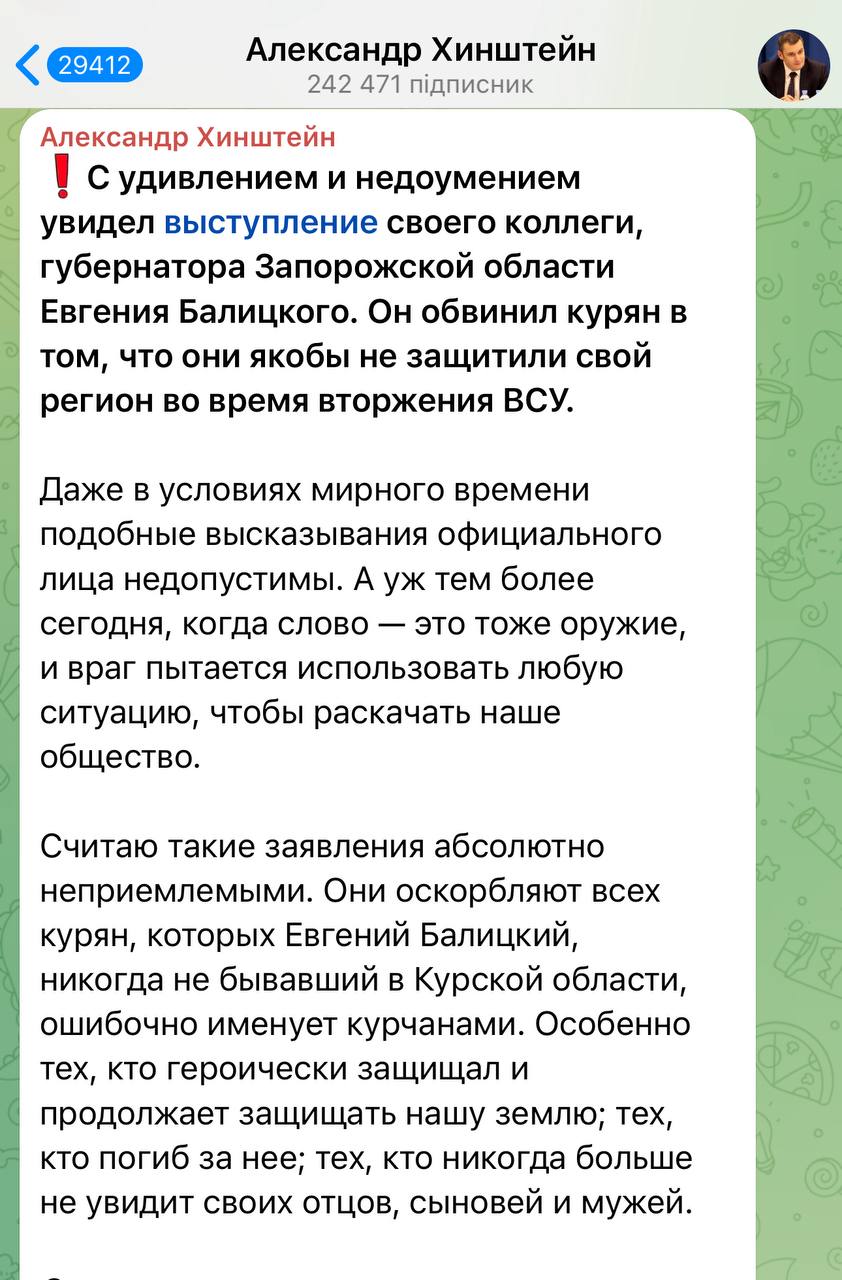 В телевизионном эфире Балицкий заявил (на языке оригинала): "В 2023 году мы защитили Запорожскую область, не чета курчанам".
