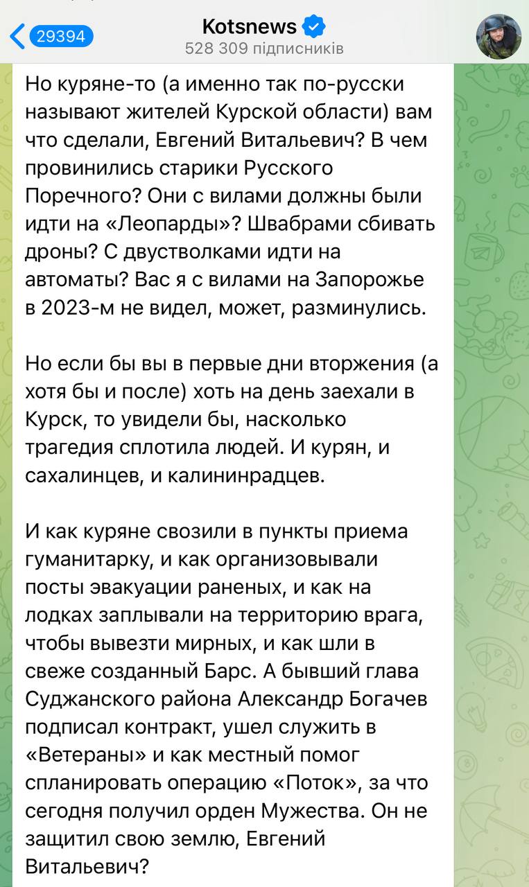 Назначенный Кремлем глава оккупированной части Запорожской области стал мишенью для российских пропагандистов, якобы возмущенных высказыванием Балицкого в адрес жителей Курской области РФ. Соответствующие посты "зэтников" собрал украинский журналист и блогер Денис Казанский, передает "Справжнє".