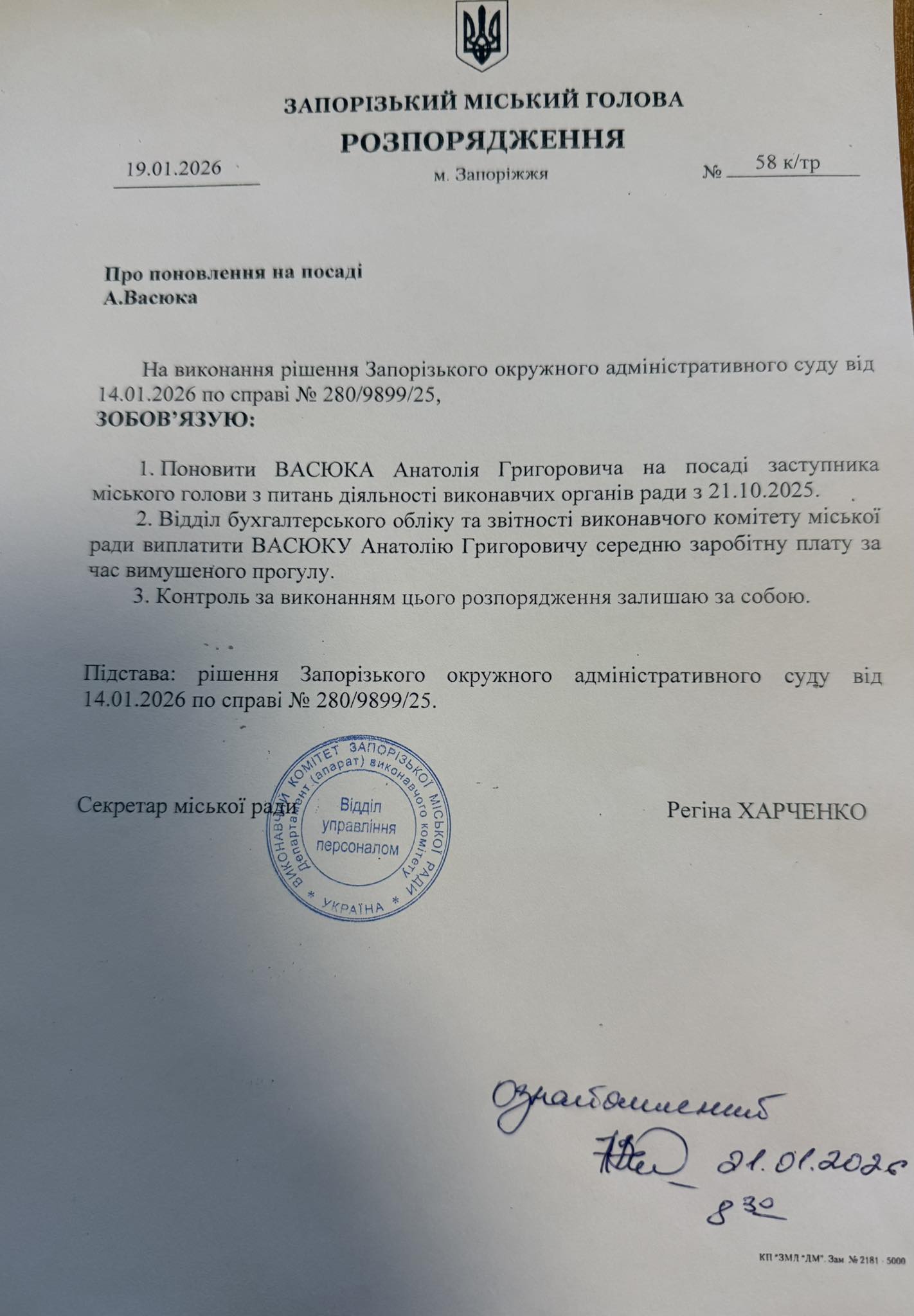 Напомним также, что Анатолий Васюк был назначен на должность заместителя городского головы по вопросам деятельности исполнительных органов городского совета в октябре 2021 года. Впервые был уволен 20 мая 2024-го. В августе 2025 года Третий апелляционный административный суд Днепра признал противоправным и отменил решение Запорожского городского совета об увольнении заместителя городского головы и восстановил его в должности.
