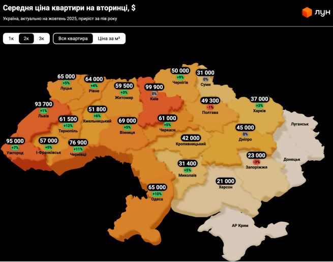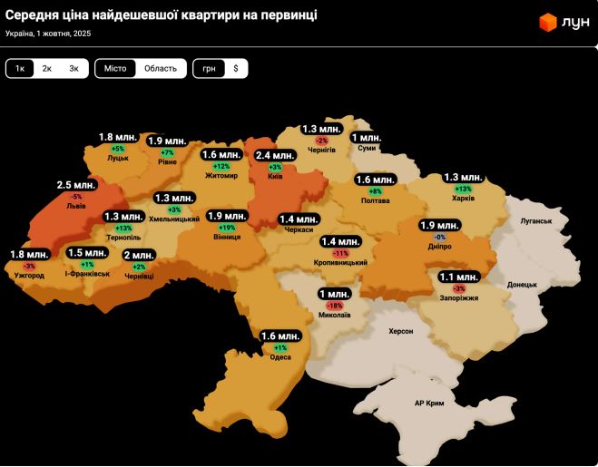 Полная минимальная стоимость 1-комнатной квартиры на "первичке" в Запорожье составляет около 1,1 миллиона гривен, что является одной из самых низких цен по Украине.