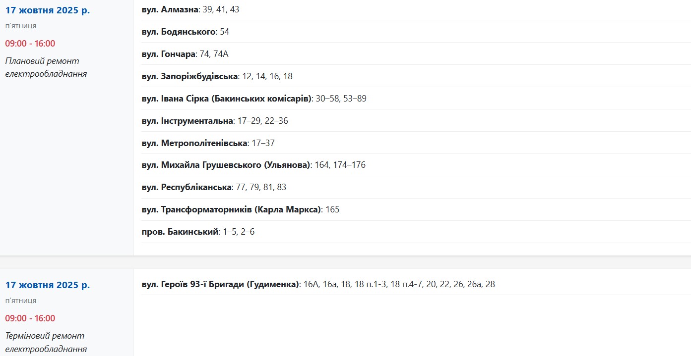 В пятницу, 17 октября, более 100 улиц в Запорожье временно останутся без электроснабжения. Об этом сообщает "Справжнє" со ссылкой на Запорожьеоблэнерго.