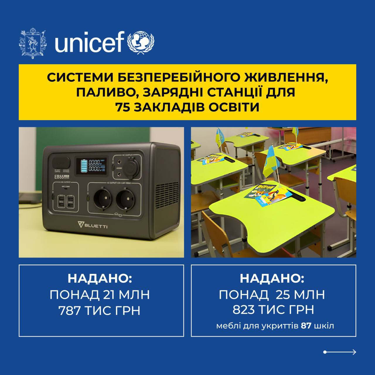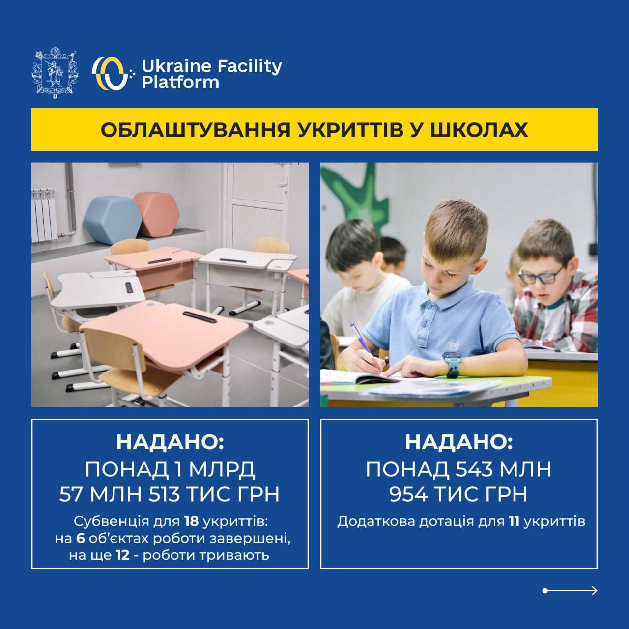 На обустройство укрытий в школах международные партнеры передали более 1 миллиарда 57 миллионов 513 тысяч гривен. Это субвенция для 18 укрытий: в шести из них – ремонт уже завершили, на еще 12 – работы продолжаются. Дополнительно область получила дотацию для 11 укрытий в размере более 543 миллионов 954 тысяч гривен.