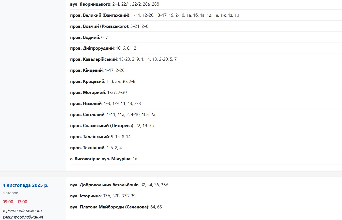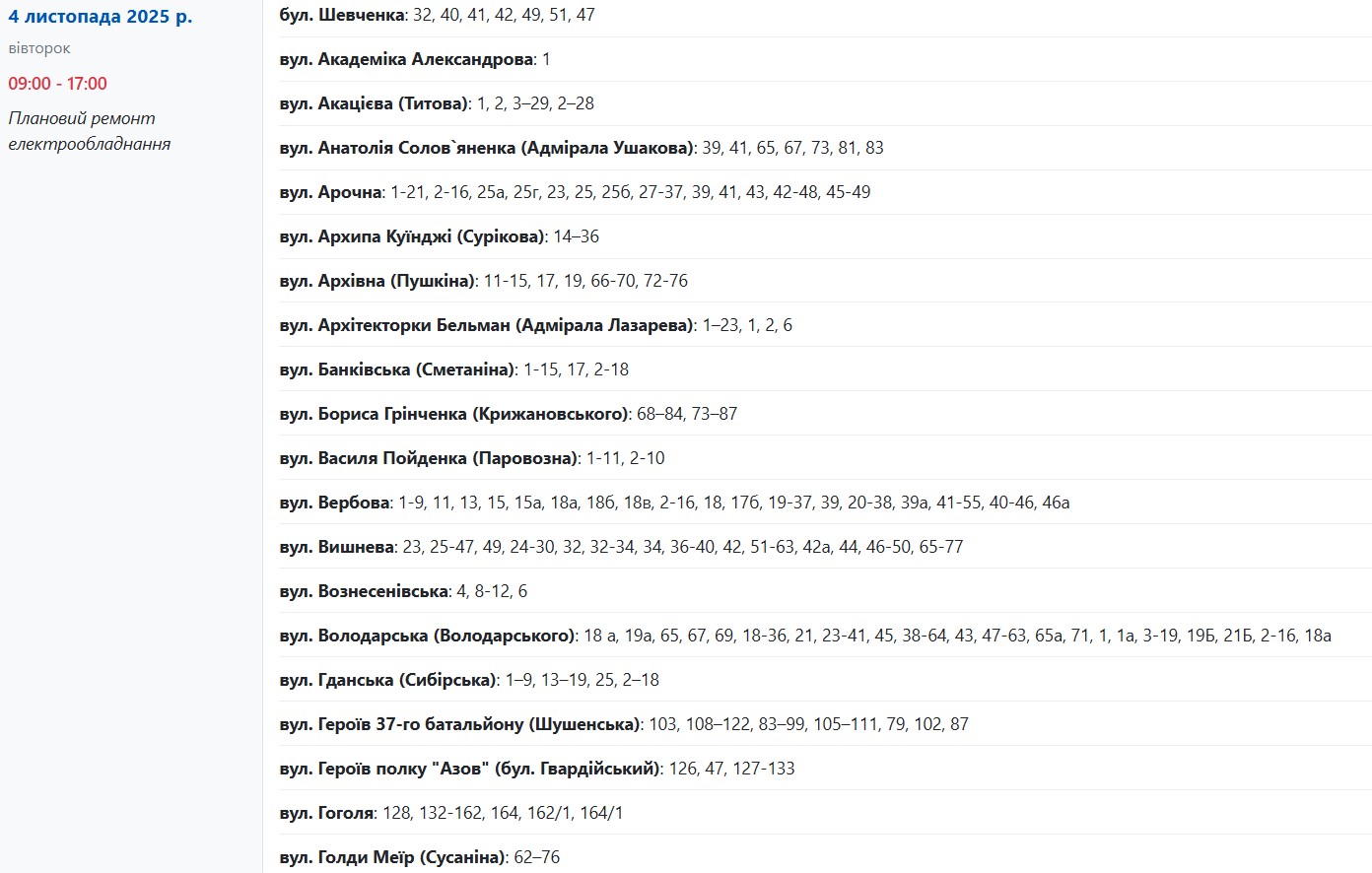 Во вторник, 4 ноября, в Запорожье временно обесточат более 100 улиц. Об этом сообщает Запорожьеоблэнерго, передает "Справжнє".