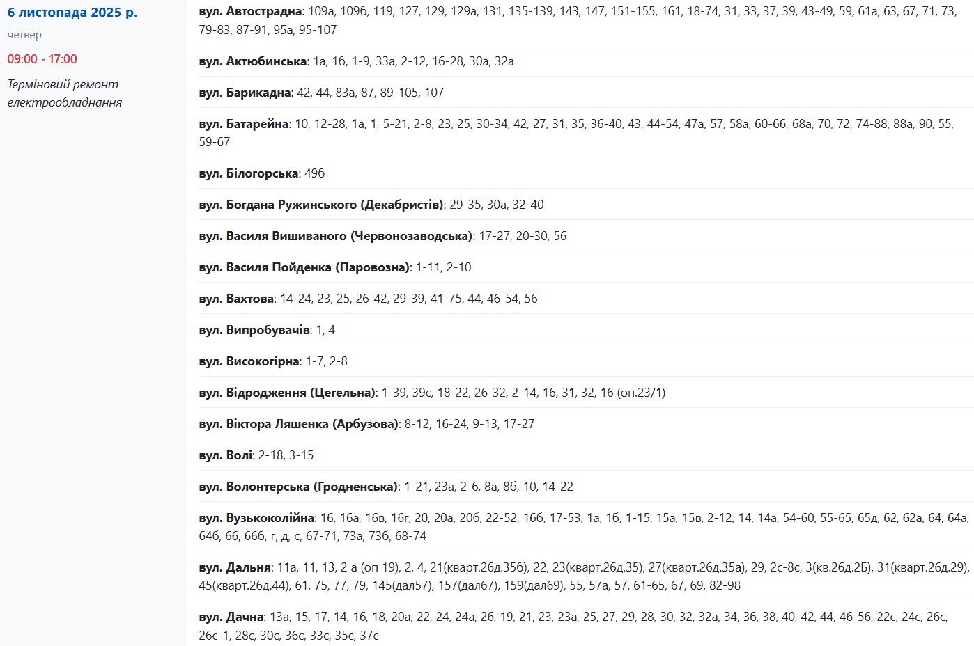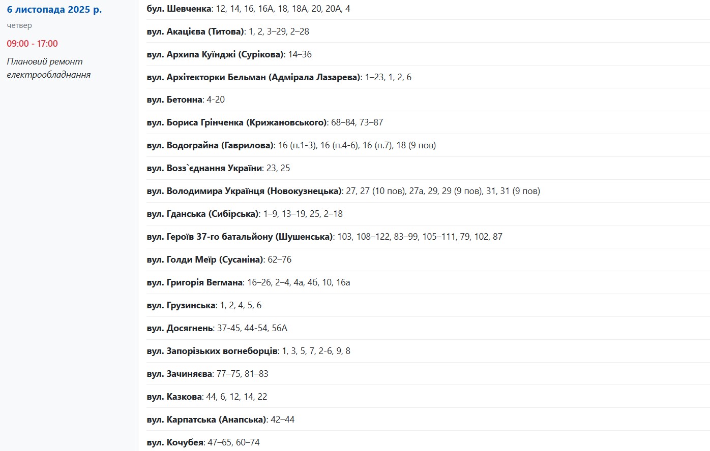 С 09:00 до 17:00 из-за срочного ремонта электрооборудования света не будет по адресам: