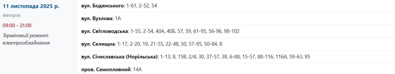 Целых 12 часов, с 09:00 до 21:00, электрооборудование будут ремонтировать по адресам: