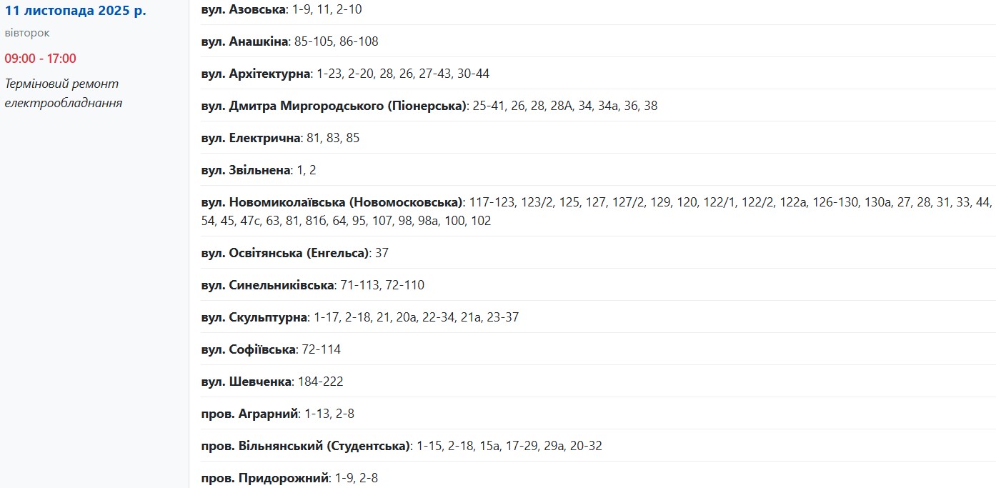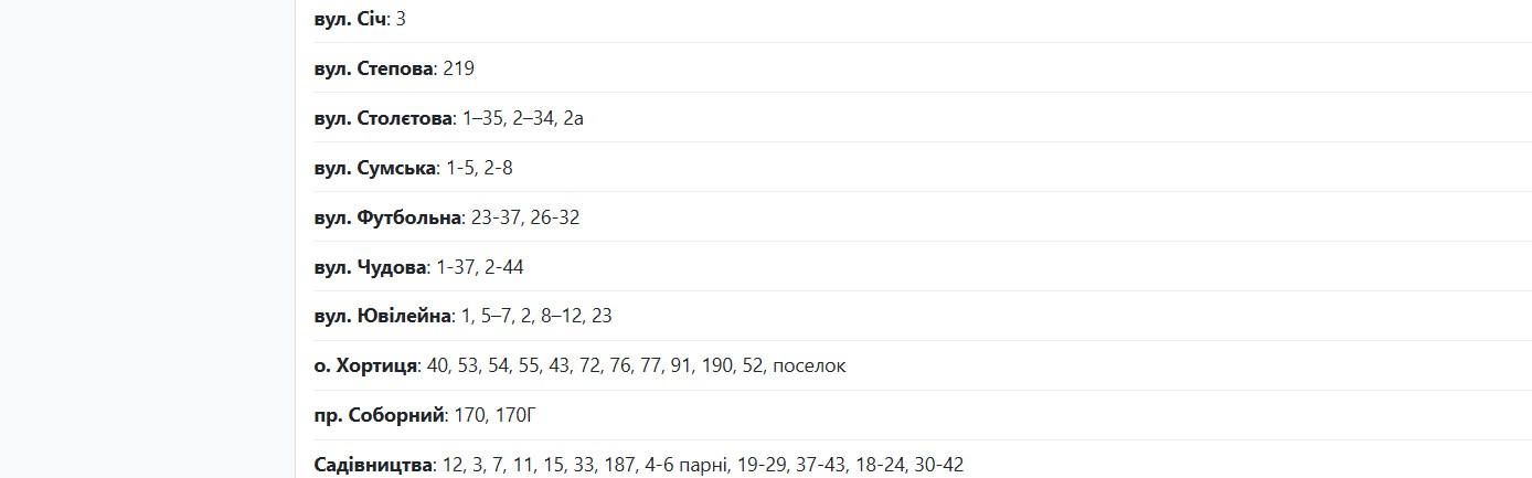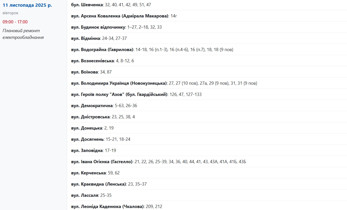 Во вторник, 11 ноября, в Запорожье временно обесточат 70 улиц. Об этом сообщает Запорожьеоблэнерго, передает "Справжнє".