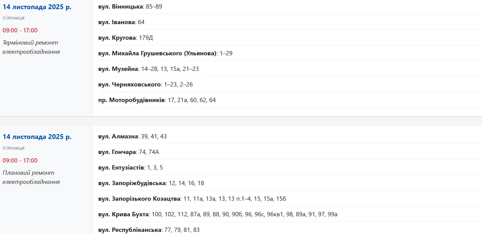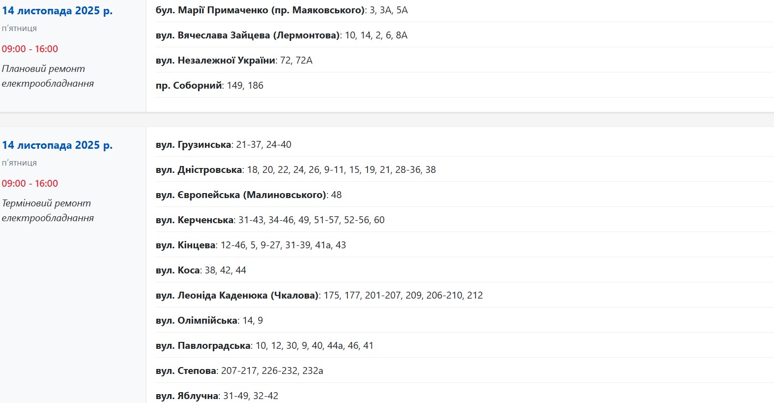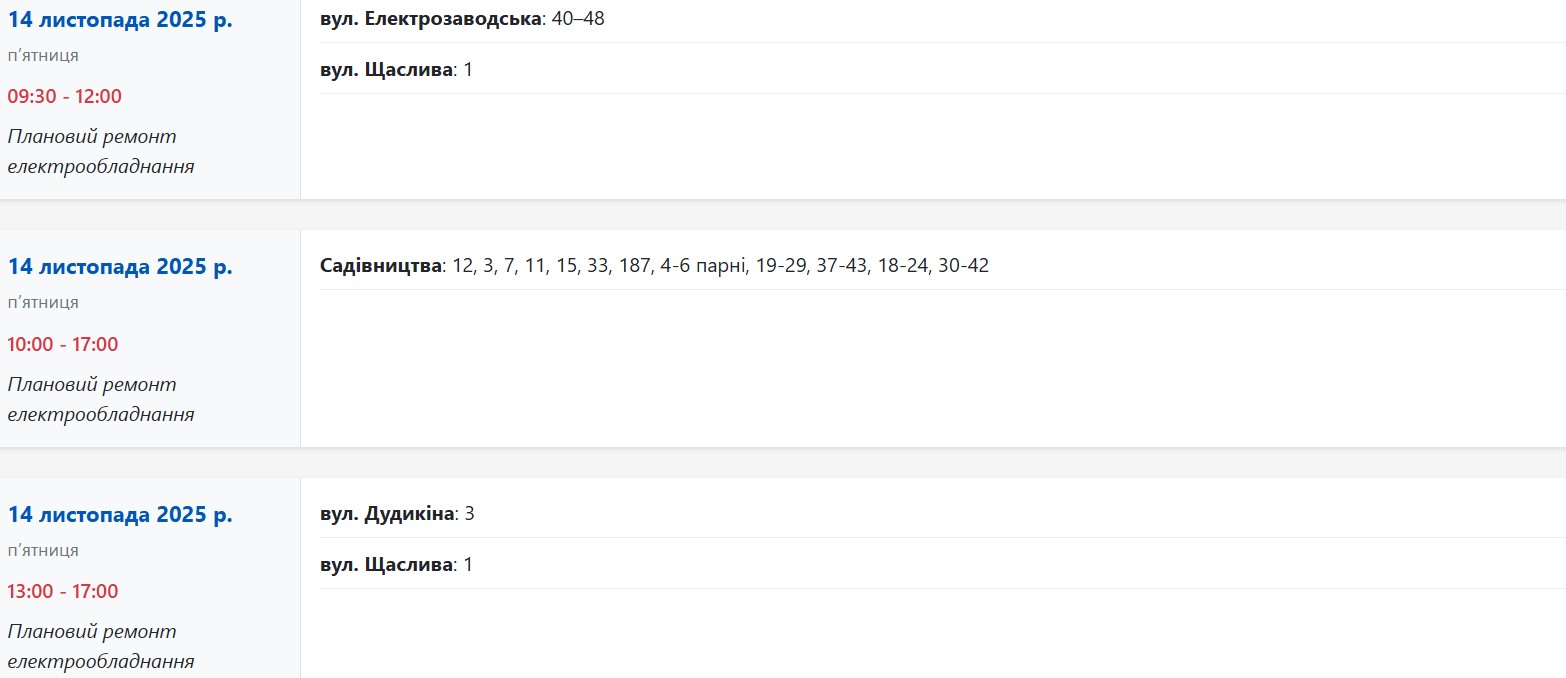 Также с 09:00 до 16:00 свет будут выключать из-за планового и срочного ремонта электрооборудования по следующим адресам: