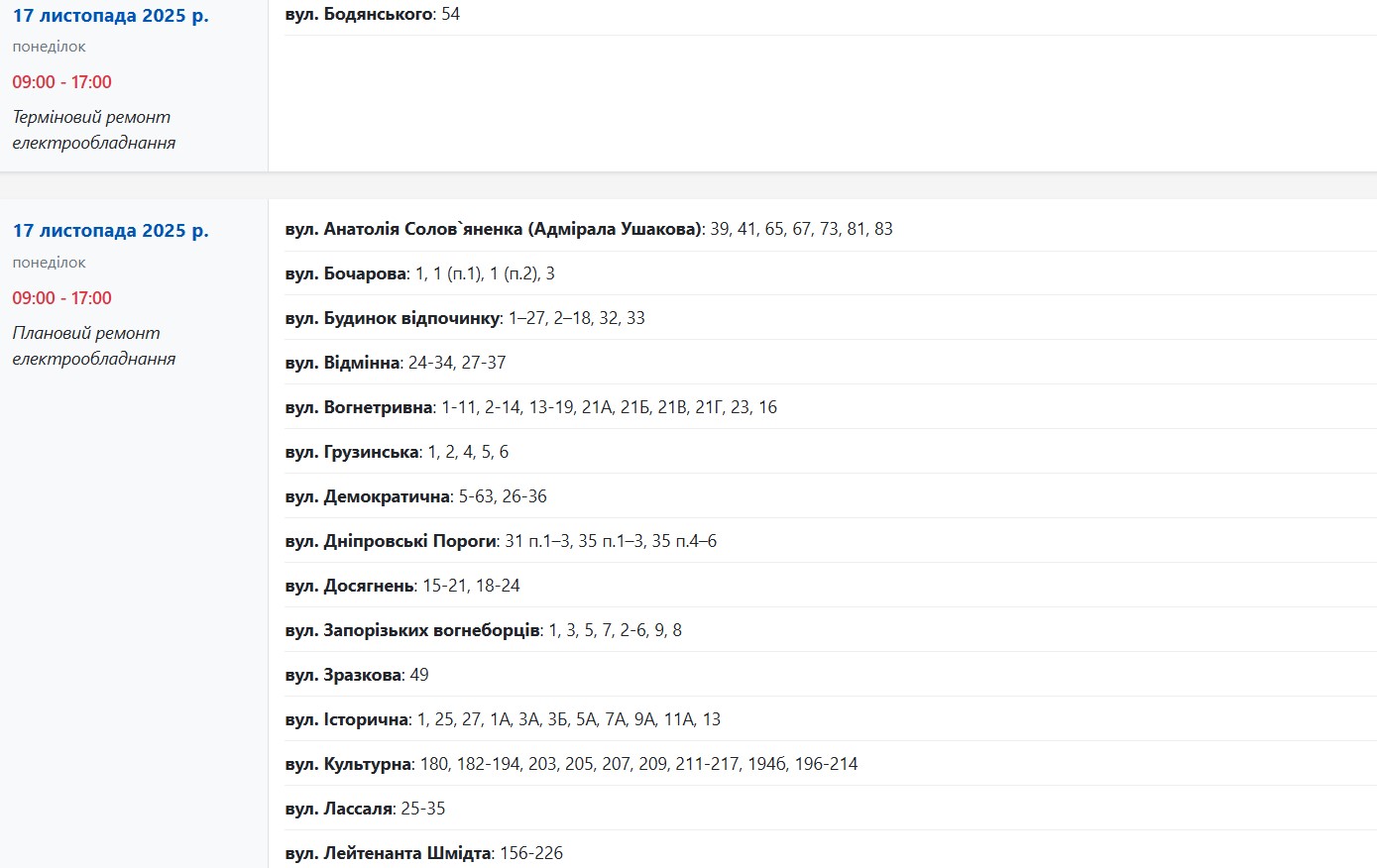 В понедельник, 17 ноября, более 70 улиц в Запорожье временно останутся без электроснабжения. Об этом сообщает "Справжнє" со ссылкой на Запорожьеоблэнерго.