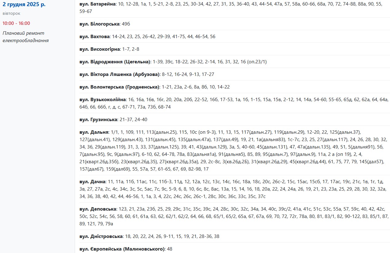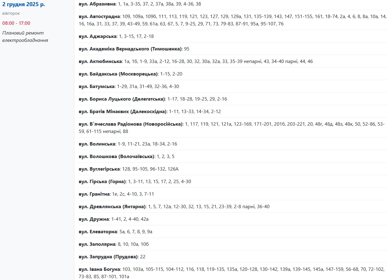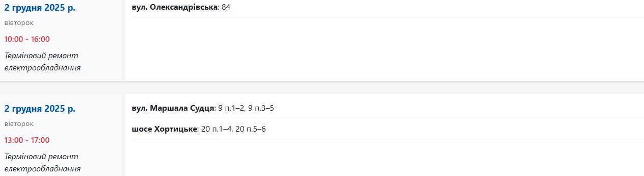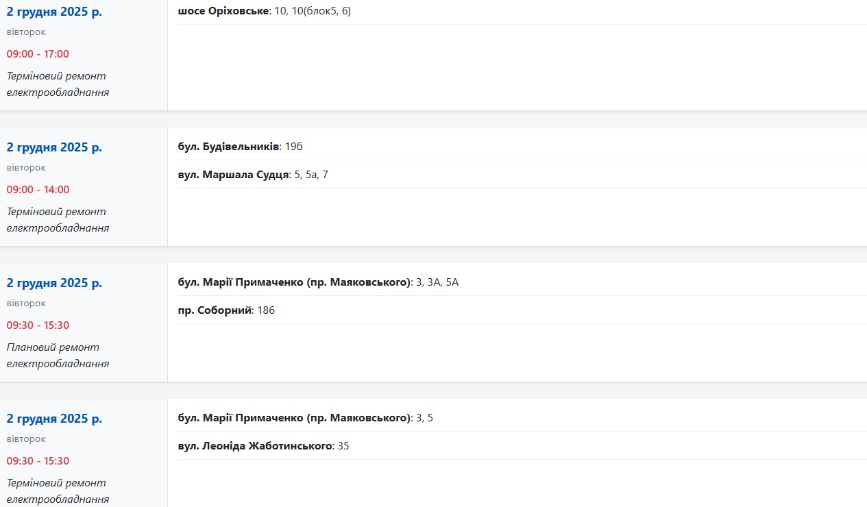 Во вторник, 2 декабря, в Запорожье временно обесточат более 160 улиц. Об этом сообщает Запорожьеоблэнерго, передает "Справжнє".