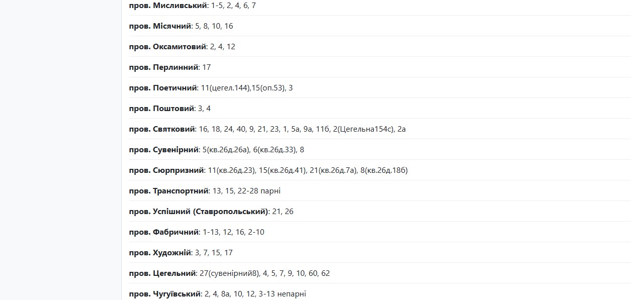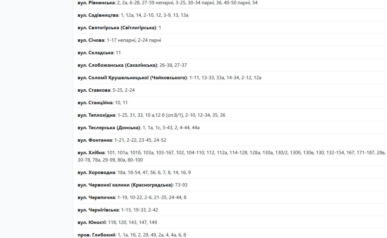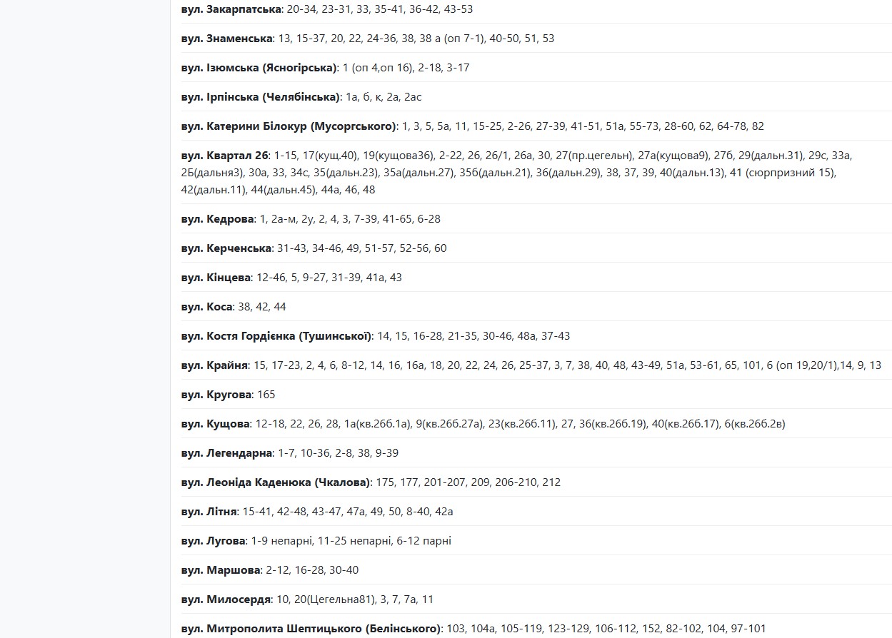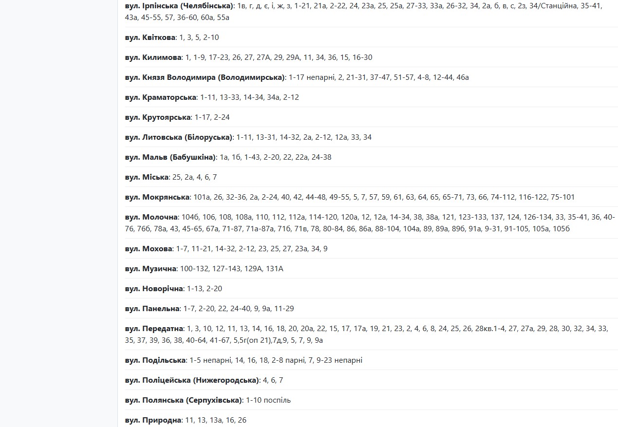 В течение суток света не будет по следующим адресам: