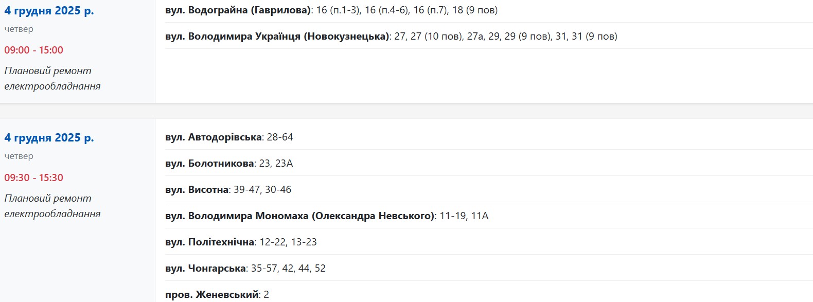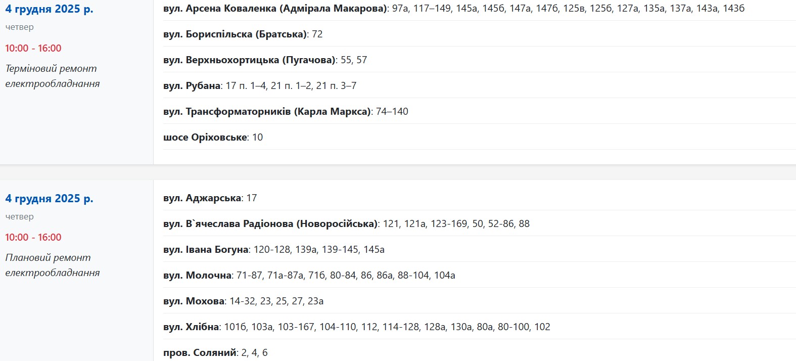 В разных районах Запорожья временно обесточат более двух десятков улиц в четверг, 4 декабря. Об этом сообщает АО "Запорожьеоблэнерго", передает "Справжнє".