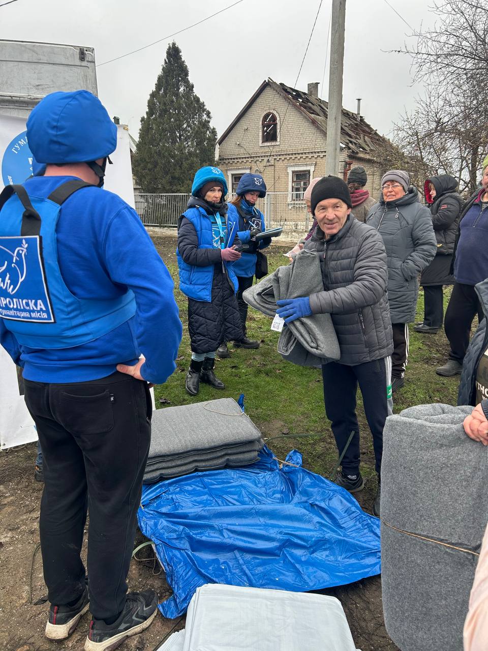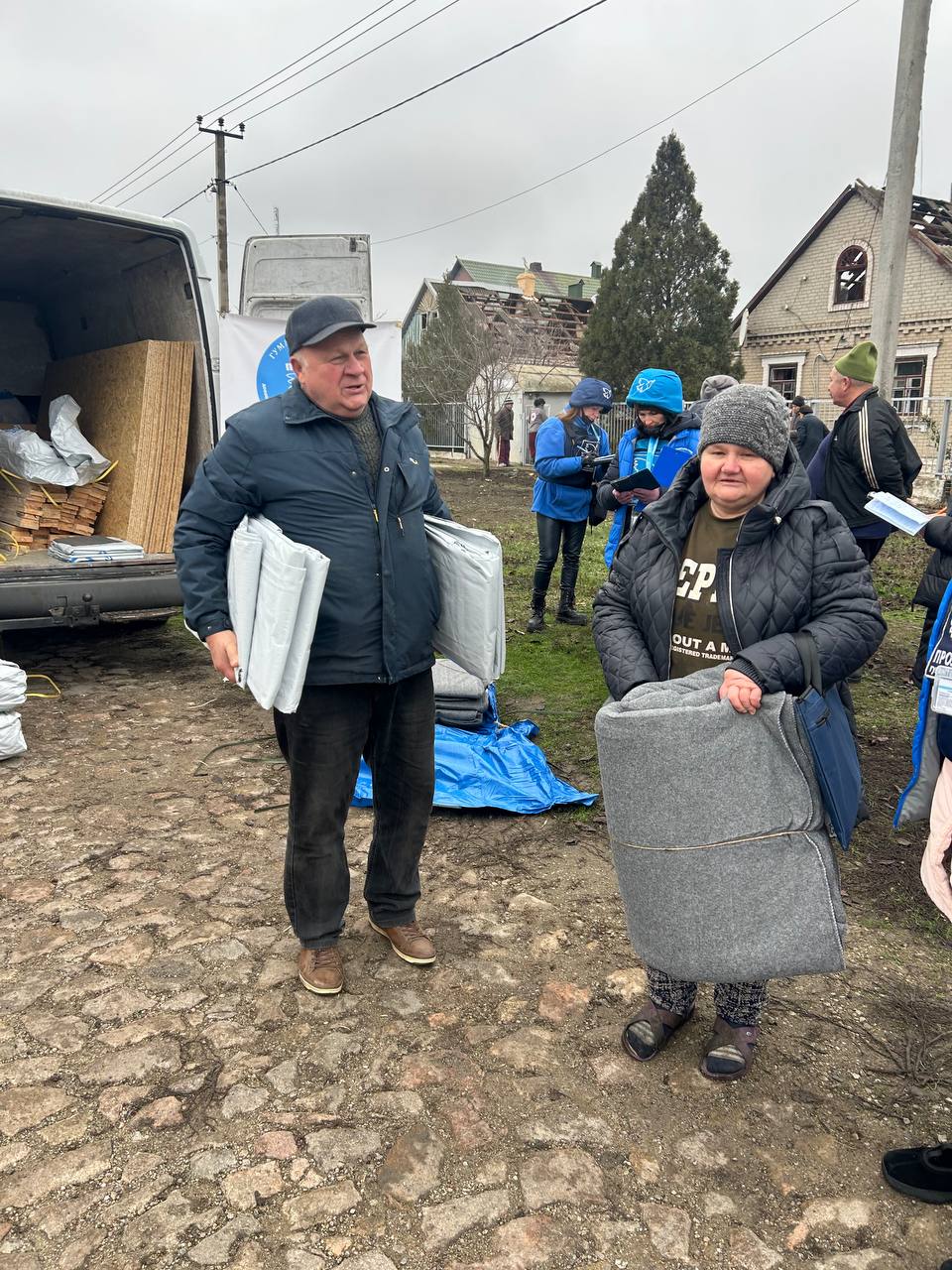 Вольнянский городской совет вместе с волонтерами гуманитарной миссии "Проліска" раздают местным листы OSB, рейки, брезент и теплые одеяла.