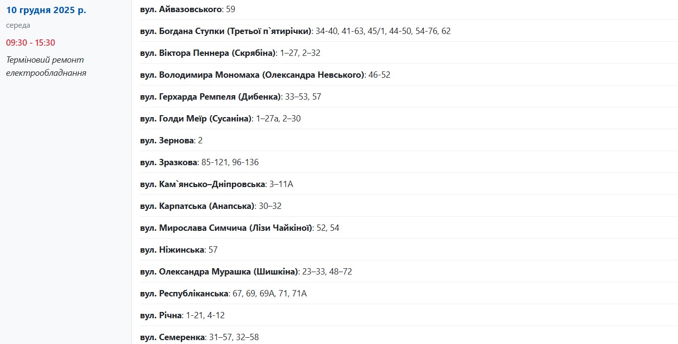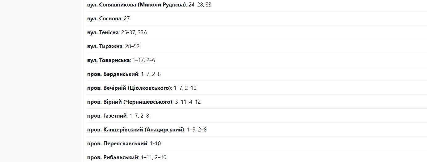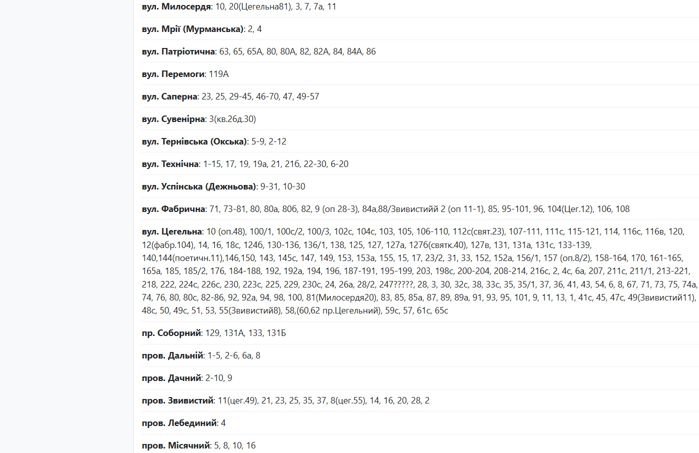 Также в период с 10:00 до 16:00 света не будет у запорожцев, проживающих в домах по адресам: