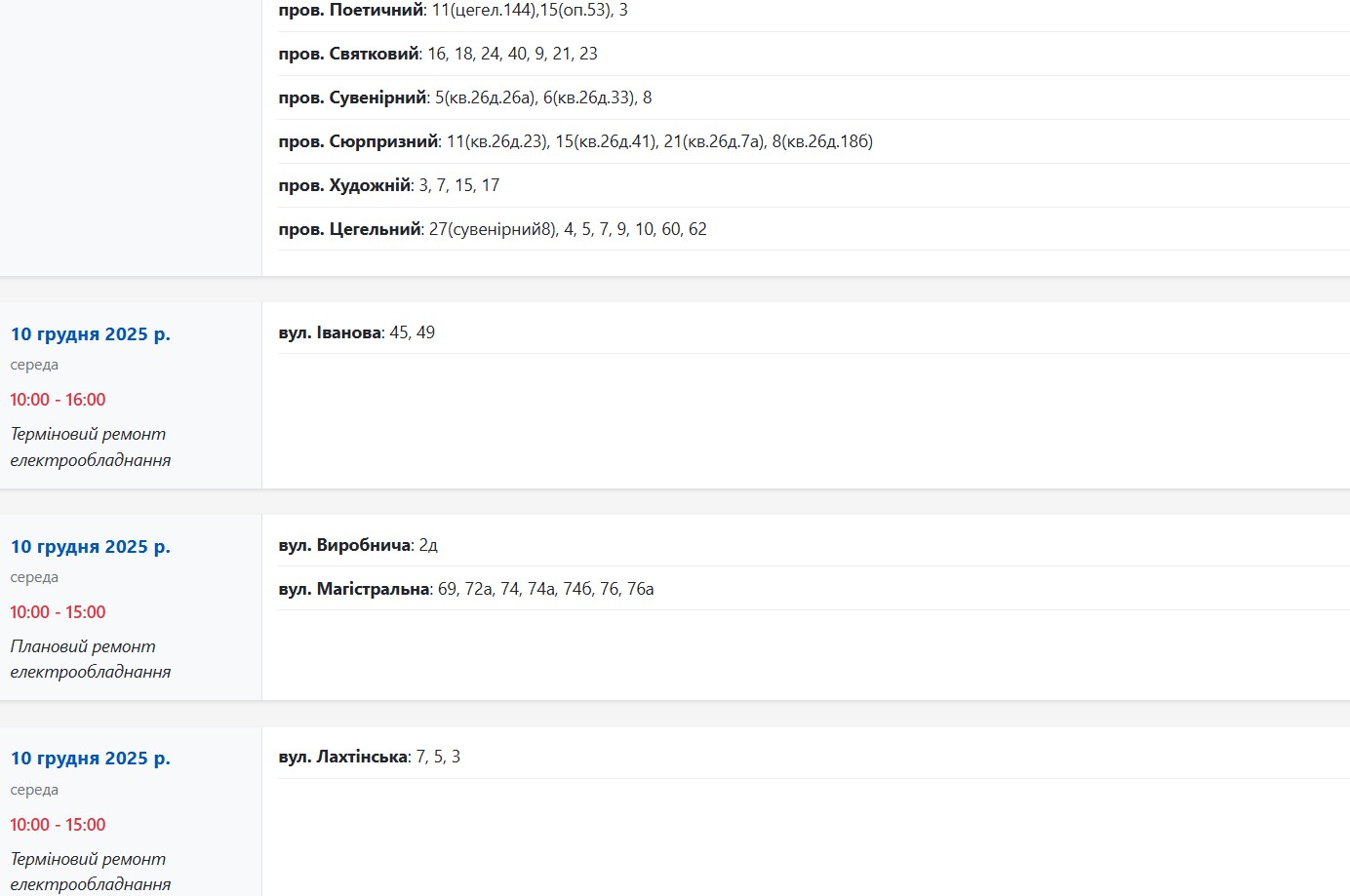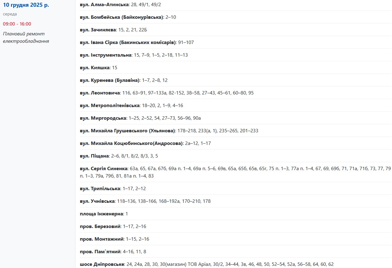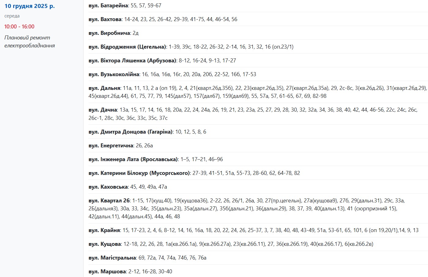 Также в период с 10:00 до 16:00 света не будет у запорожцев, проживающих в домах по адресам: