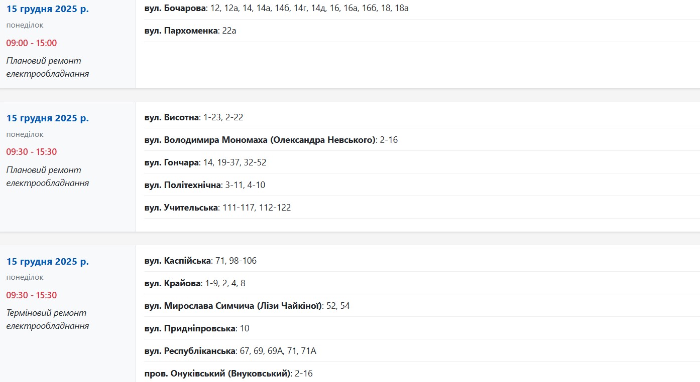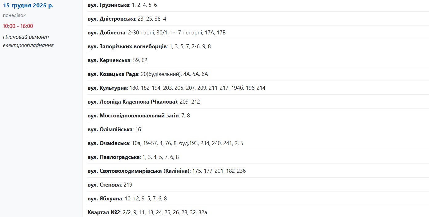 В понедельник, 15 декабря, около трех десятков улиц в Запорожье временно останутся без электроснабжения. Об этом сообщает "Справжнє" со ссылкой на Запорожьеоблэнерго.