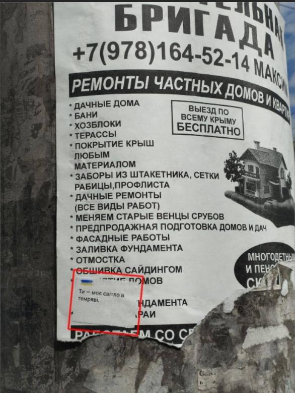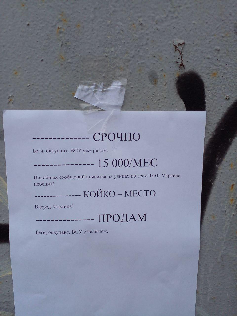 На улицах временно оккупированного Мелитополя появились объявления со скрытым содержанием и проукраинскими месседжами. Об этом сообщили активисты движения сопротивления "Желтая лента", передает "Справжнє".