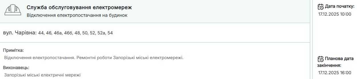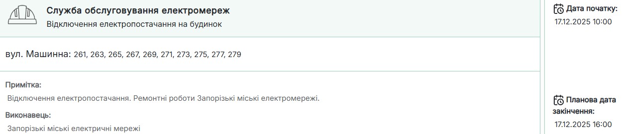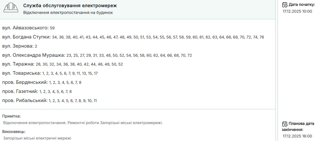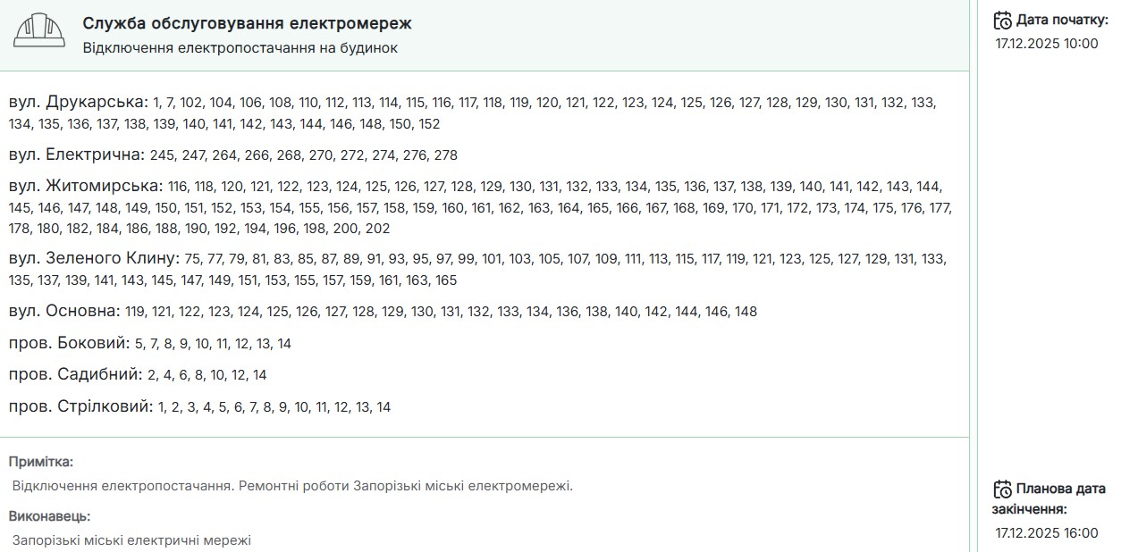 В среду, 17 декабря, в Запорожье временно обесточили около двух десятков улиц. Об этом сообщает "Справжнє" со ссылкой на городской контакт-центр "15-80".