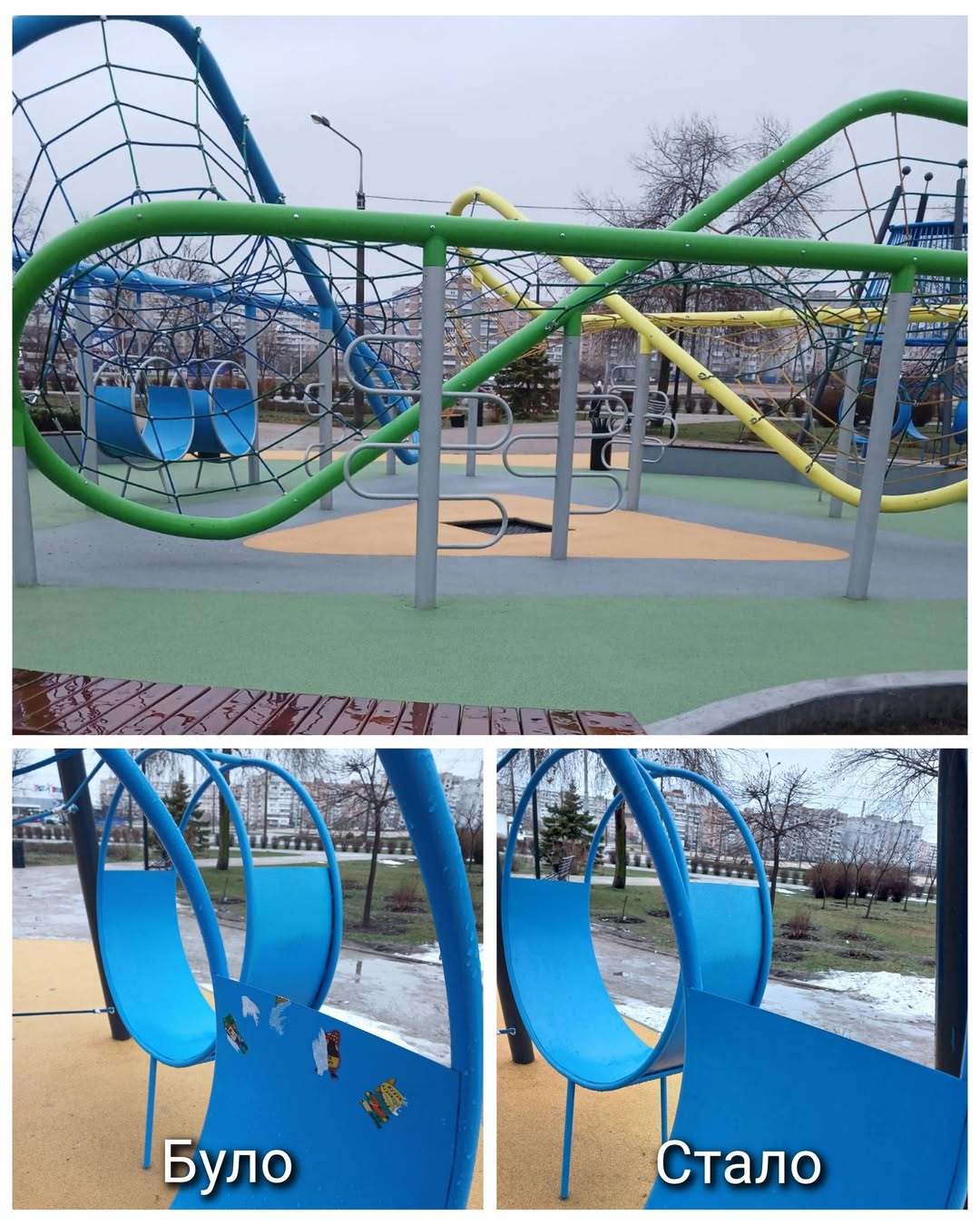 Коммунальщики почистили от надписей и наклеек элементы детской площадки, которую в конце прошлого года открыли в парке на улице Нагнибиды в Космическом районе.