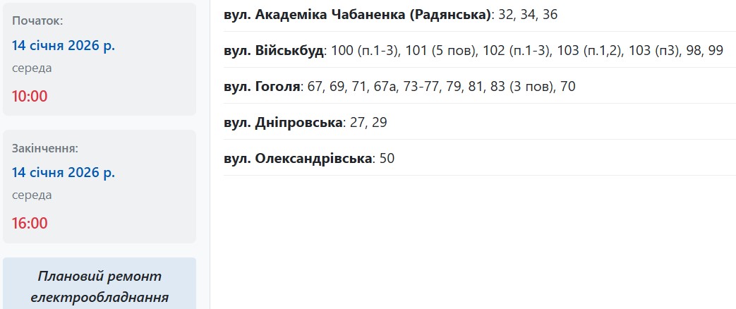 В среду, 14 января, в Запорожье временно обесточат несколько улиц в Александровском и Шевченковском районах. Об этом информирует "Справжнє" со ссылкой на Запорожьеоблэнерго.