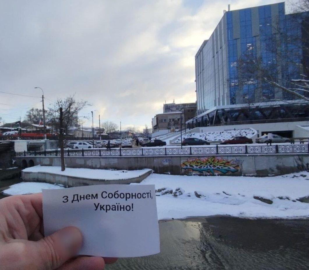 Сегодня, 22 января, активисты – от Крыма до Бердянска, от Алушты до Луганска – объединились, чтобы поздравить Украину с государственным праздником – Днем Соборности. Об этом сообщает "Справжнє" со ссылкой на движение сопротивления "Желтая лента".