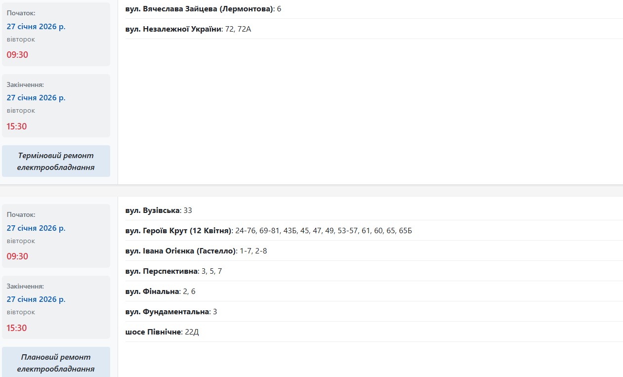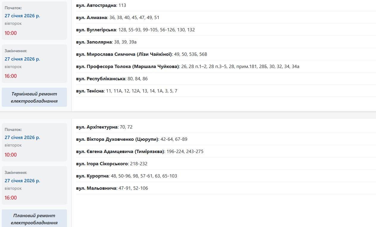 Во вторник, 27 января, в Запорожье частично обесточат более двух десятков улиц в разных районах города. Об этом сообщает Запорожьеоблэнерго, передает "Справжнє".