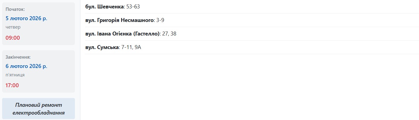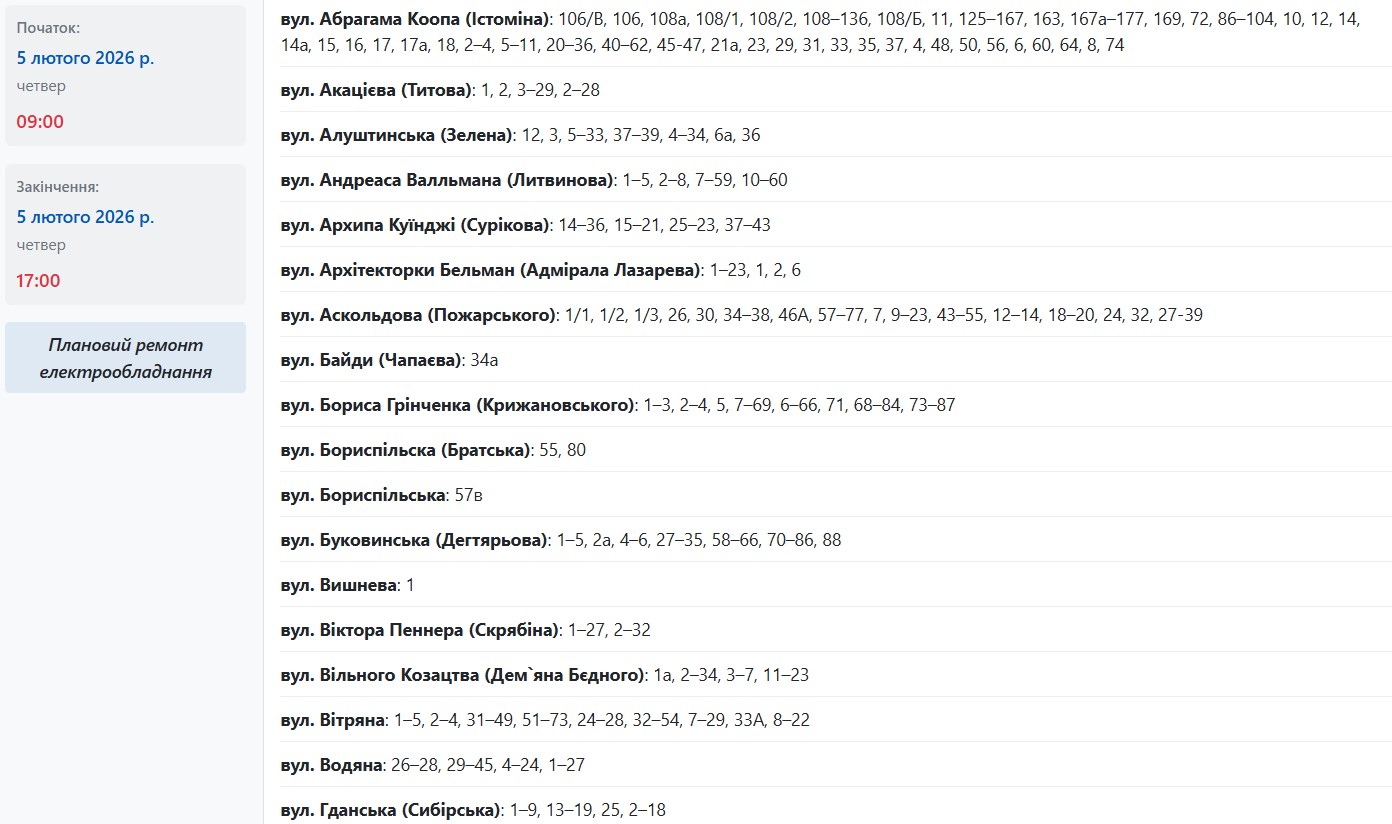 По имеющимся данным, в период с 09:00 до 17:00 энергетики выключат свет по адресам: