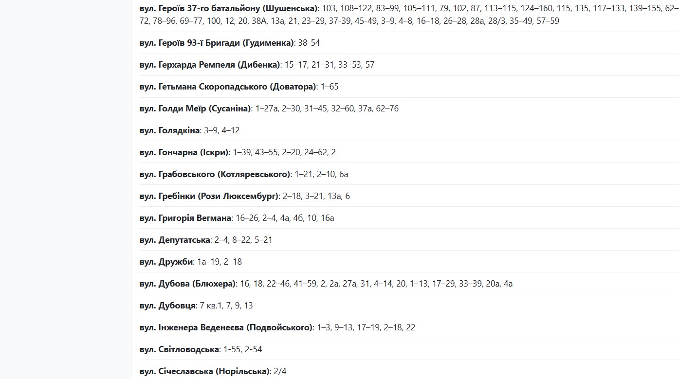 Также с 09:30 до 15:30 электричества не будет по следующим адресам: