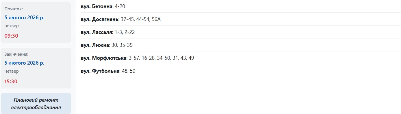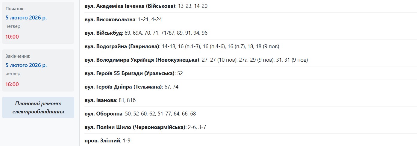 В разных районах Запорожья обесточат более полусотни улиц в четверг, 5 февраля. Об этом сообщает АО "Запорожьеоблэнерго", передает "Справжнє".