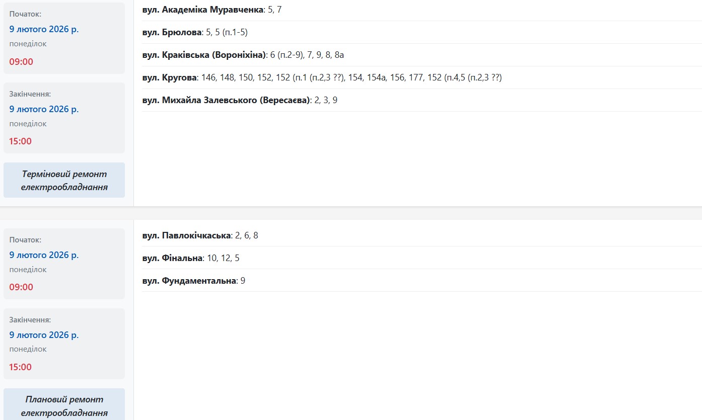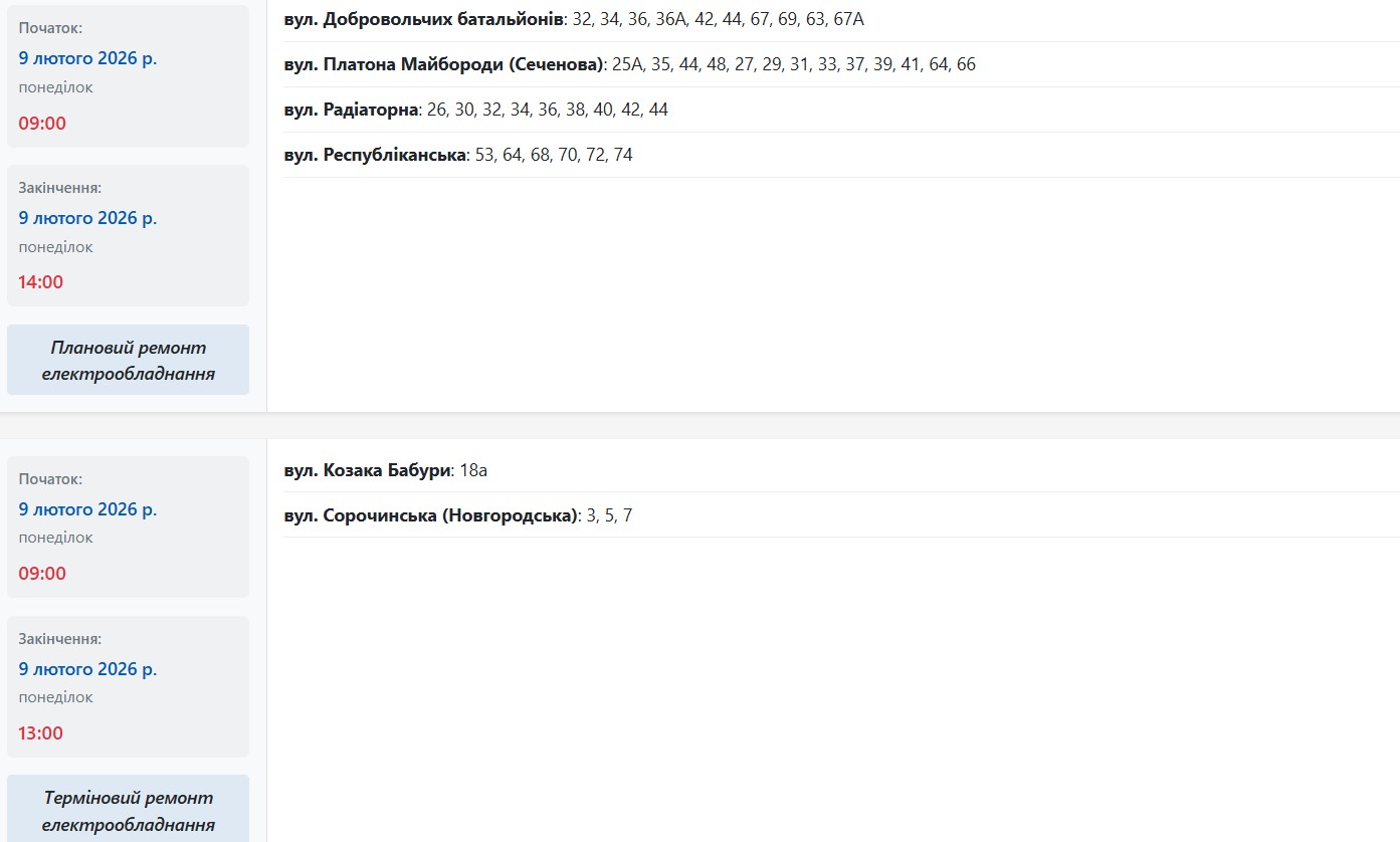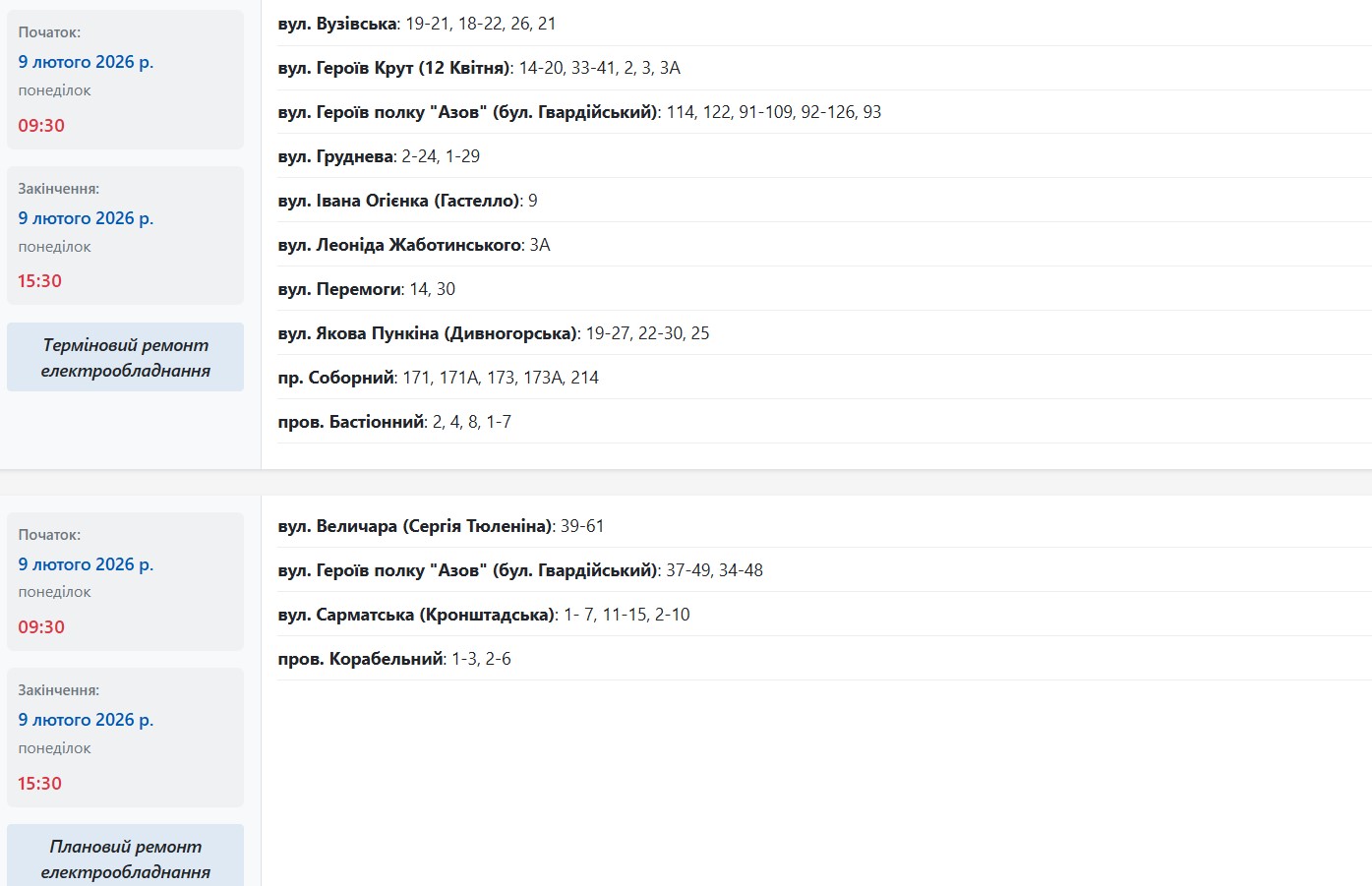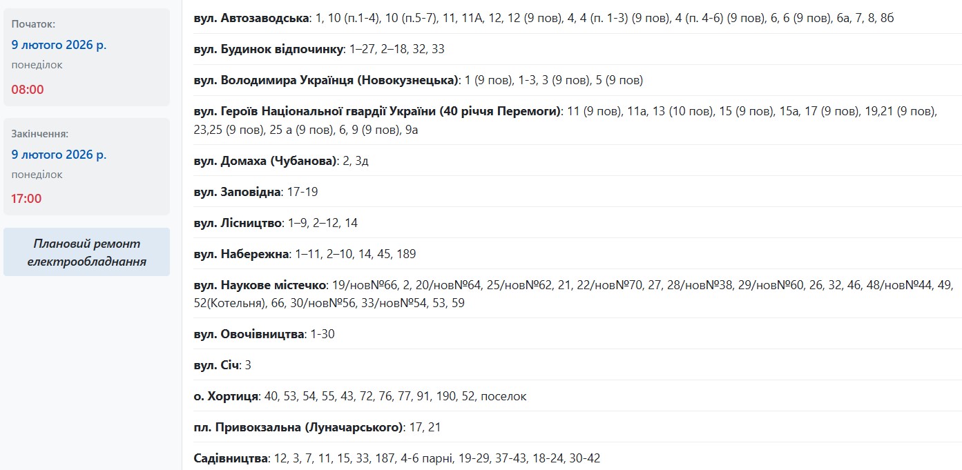 В понедельник, 9 февраля, более полусотни улиц в разных районах Запорожья останутся без электроснабжения. Об этом сообщает "Справжнє" со ссылкой на Запорожьеоблэнерго.