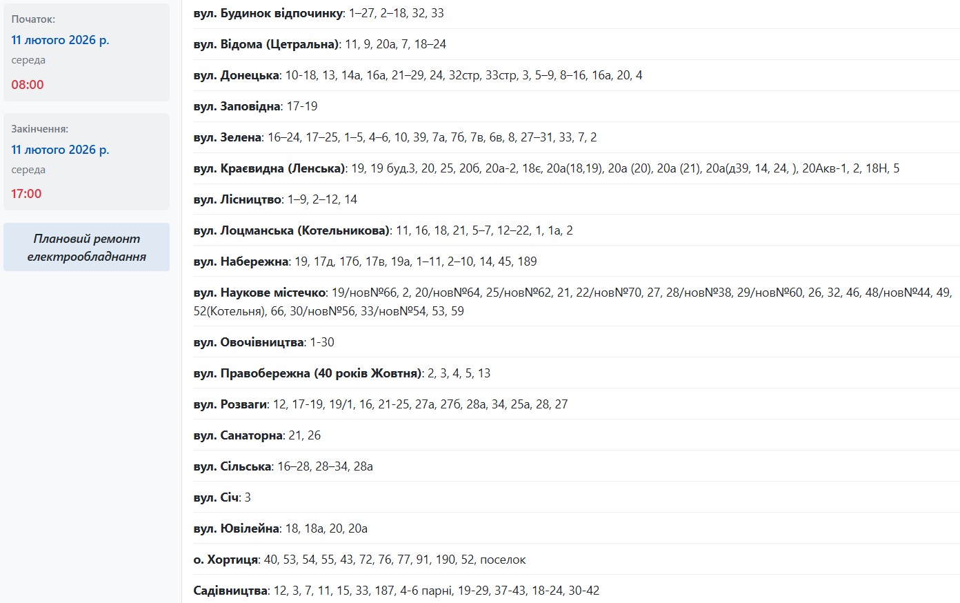 В среду, 11 февраля, временно обесточили более 70 улиц в разных районах Запорожья. Об этом информирует "Справжнє" со ссылкой на Запорожьеоблэнерго.