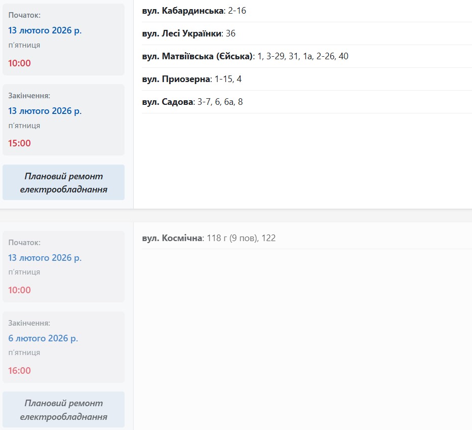 Дома на нескольких улицах в разных районах Запорожья останутся без электроснабжения в пятницу, 13 февраля. Причина – плановый ремонт электрооборудования, сообщает "Справжнє" со ссылкой на Запорожьеоблэнерго.