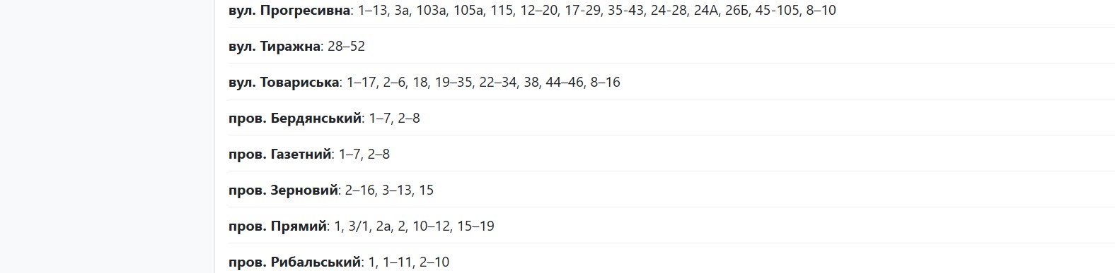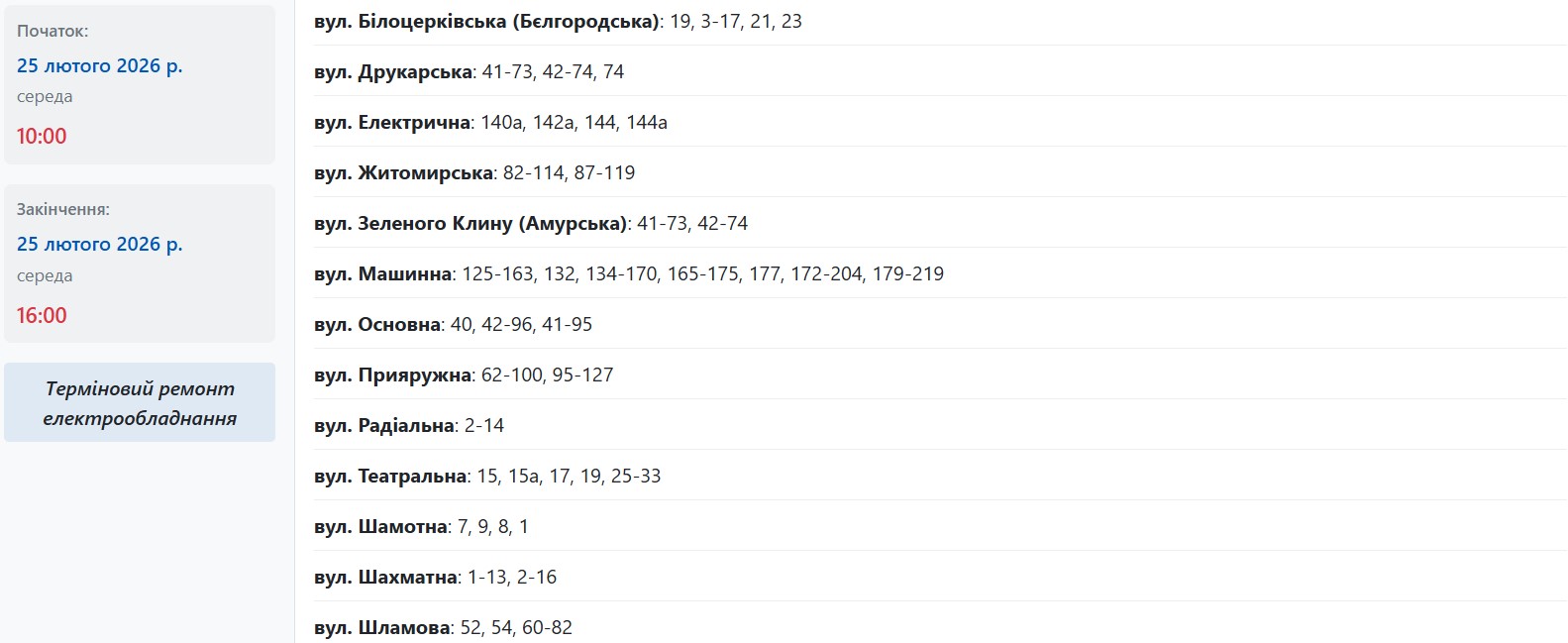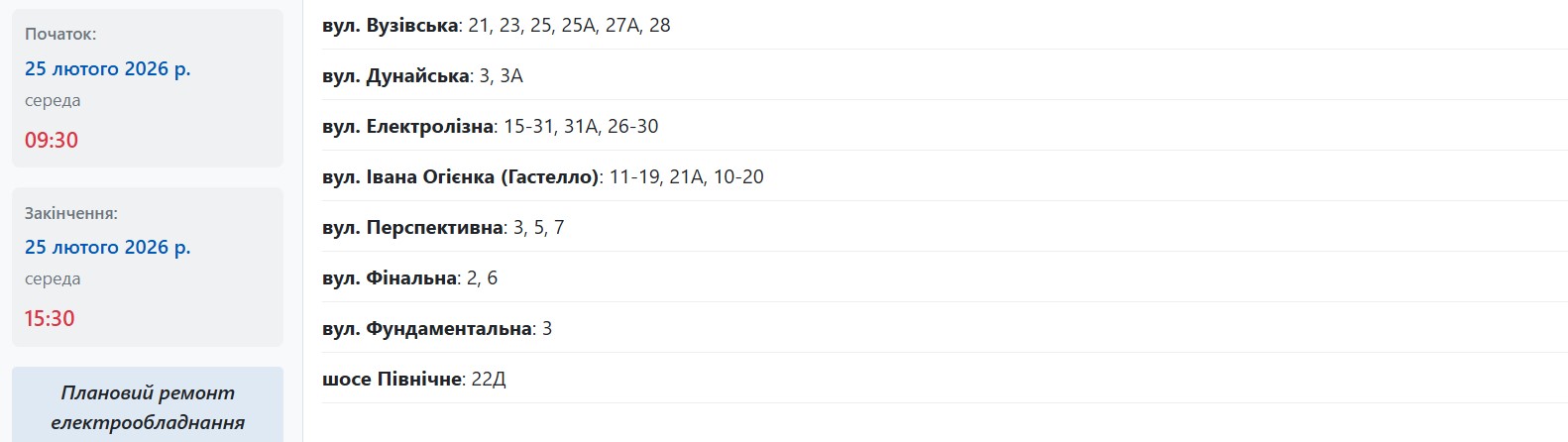 Известно, что с 09:30 до 15:30 отключат следующие адреса: