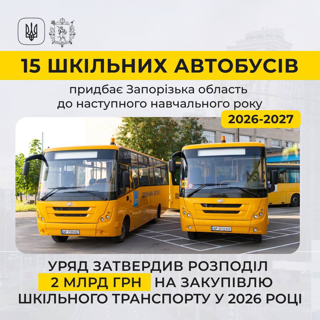 Правительство утвердило распределение двух миллиардов гривен на закупку школьного транспорта по всей Украине в 2026 году. Из этих средств – 56 миллионов гривен – получит Запорожская область в качестве государственной субвенции.