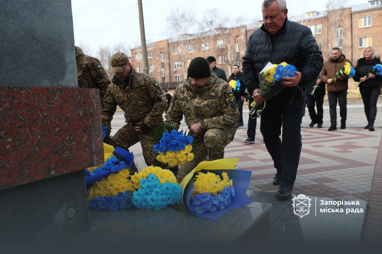 Все собравшиеся почтили память защитников Украины минутой молчания и возложили цветы к монументу.