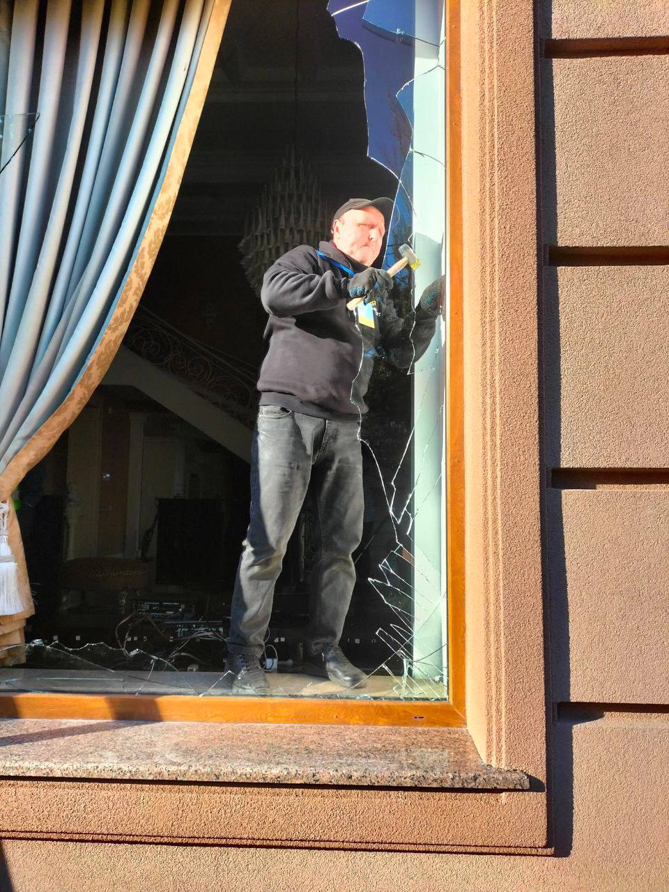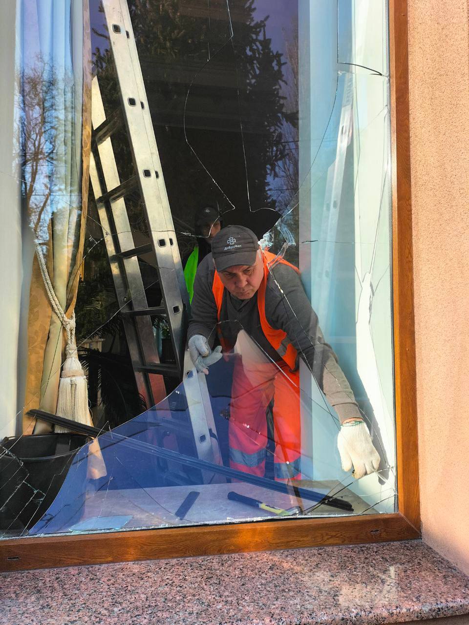 Команда активистов уже убрала острые осколки стекол и демонтировала поврежденные оконные конструкции.