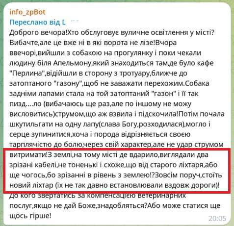 На днях в сети появилось сообщение жителя Запорожья о том, что возле магазина "Апельмон" на газоне находятся якобы опасные срезанные кабели под напряжением, из-за которых пострадала собака.