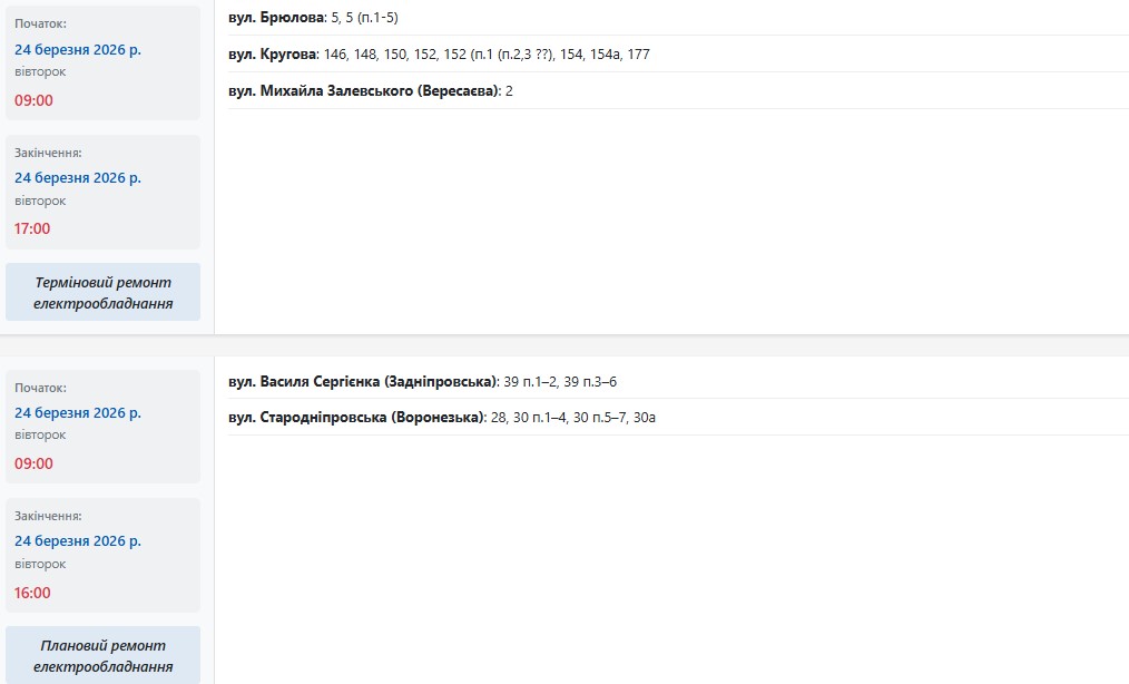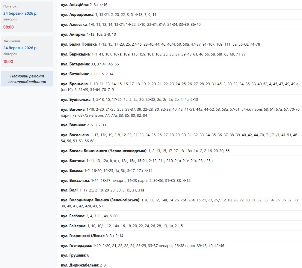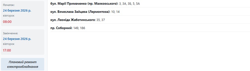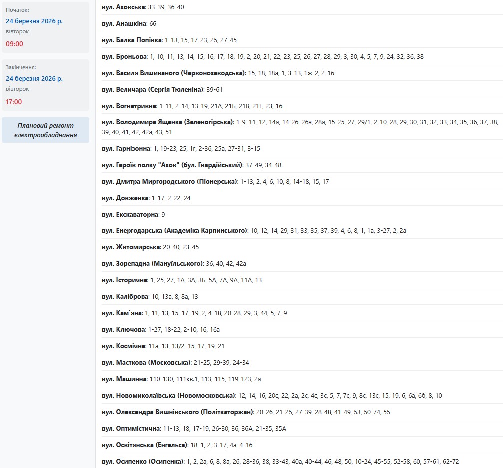 Во вторник, 24 марта, в Запорожье обесточат более 150 улиц в разных районах города. Об этом сообщает Запорожьеоблэнерго, передает "Справжнє".