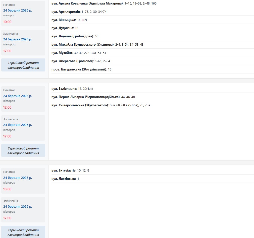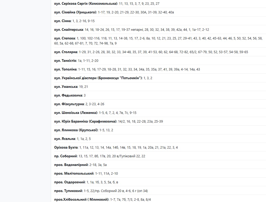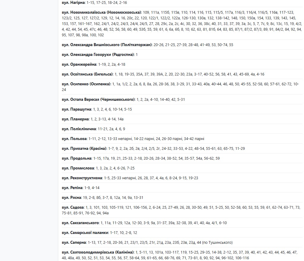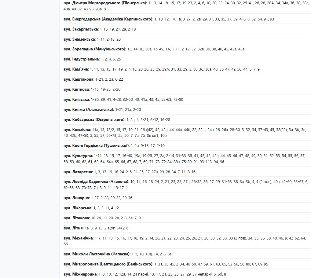 По данным энергетиков, в период с 08:00 до 18:00 света не будет по адресам: