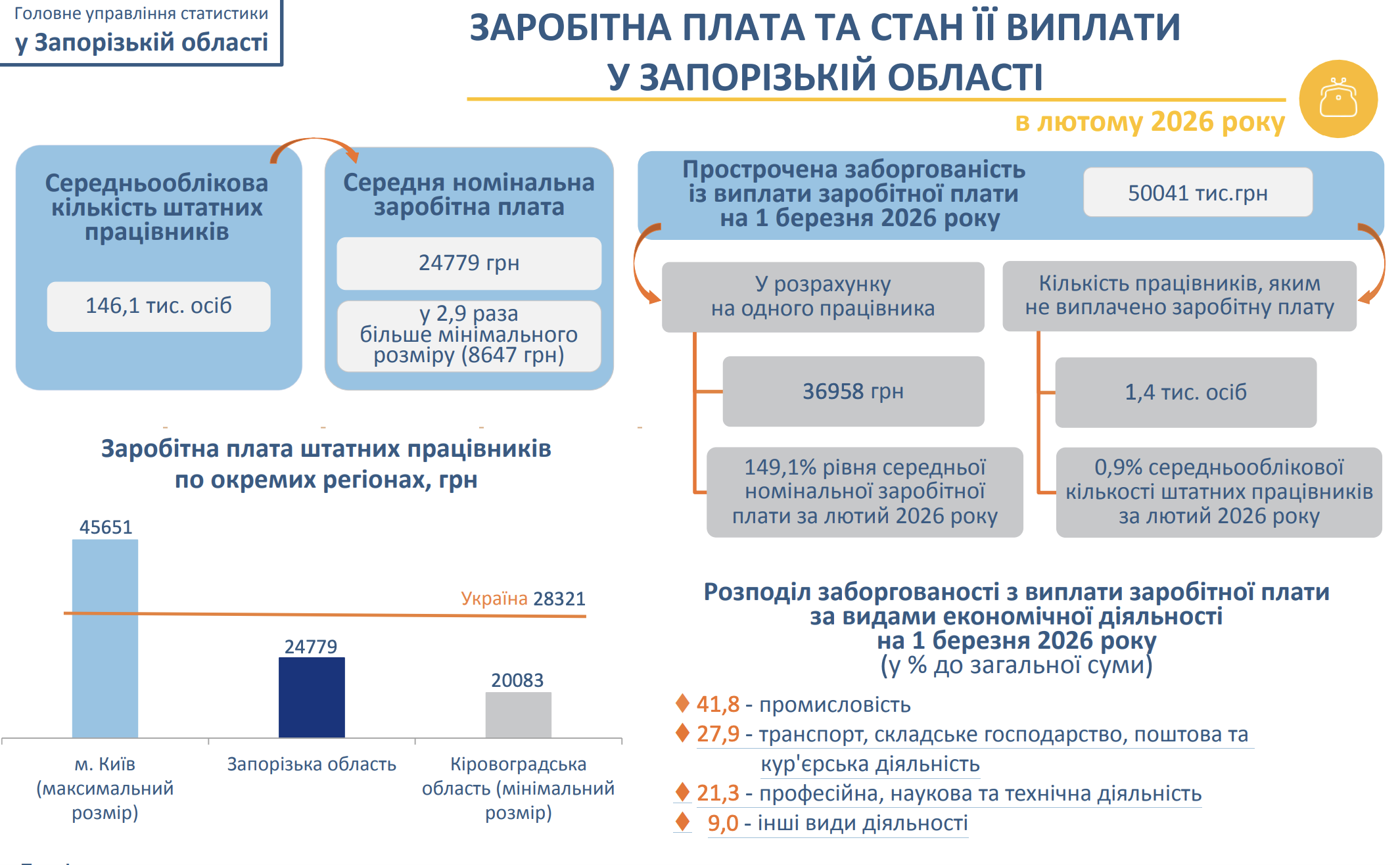 В управлении статистики отмечают, что, по состоянию на 1 марта, около 1,4 тысячи человек в области не получили заработанных денег. По подсчетам статистиков, предприятия на Запорожье задолжали работникам более 50 млн гривен.