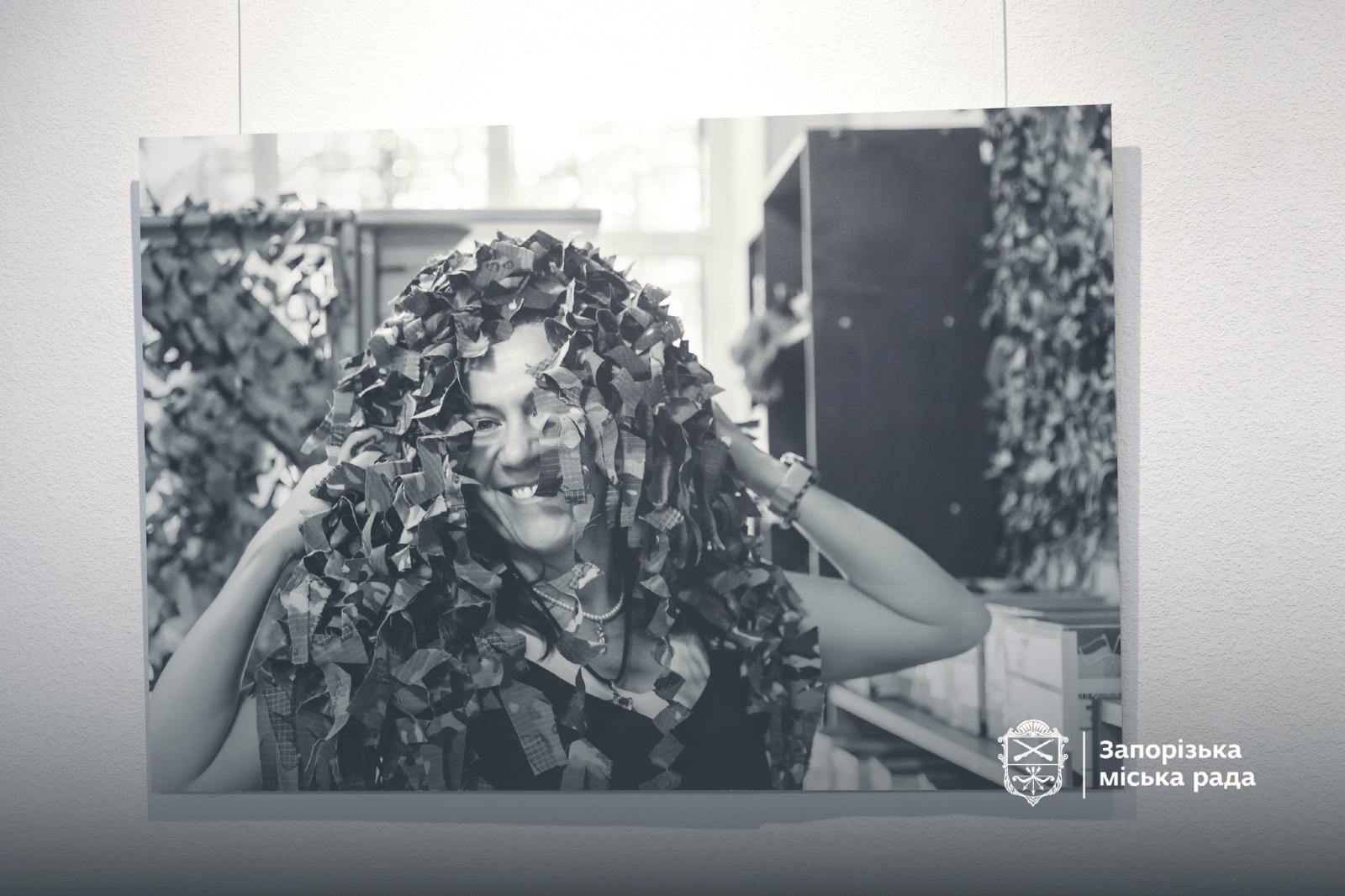 На фотографиях, представленных в экспозиции, можно увидеть ежедневный труд волонтеров организации "Под зонтиком", которые плетут маскировочные сетки для фронта.
