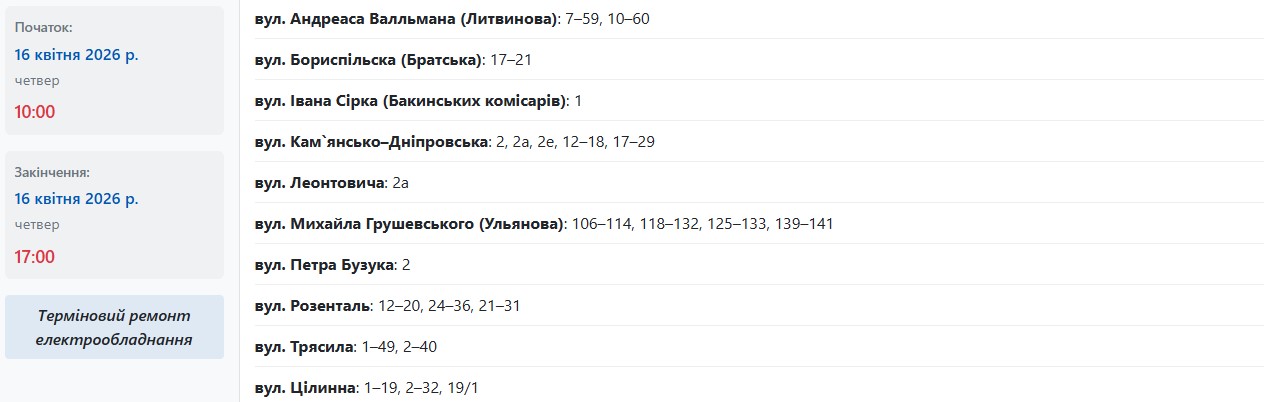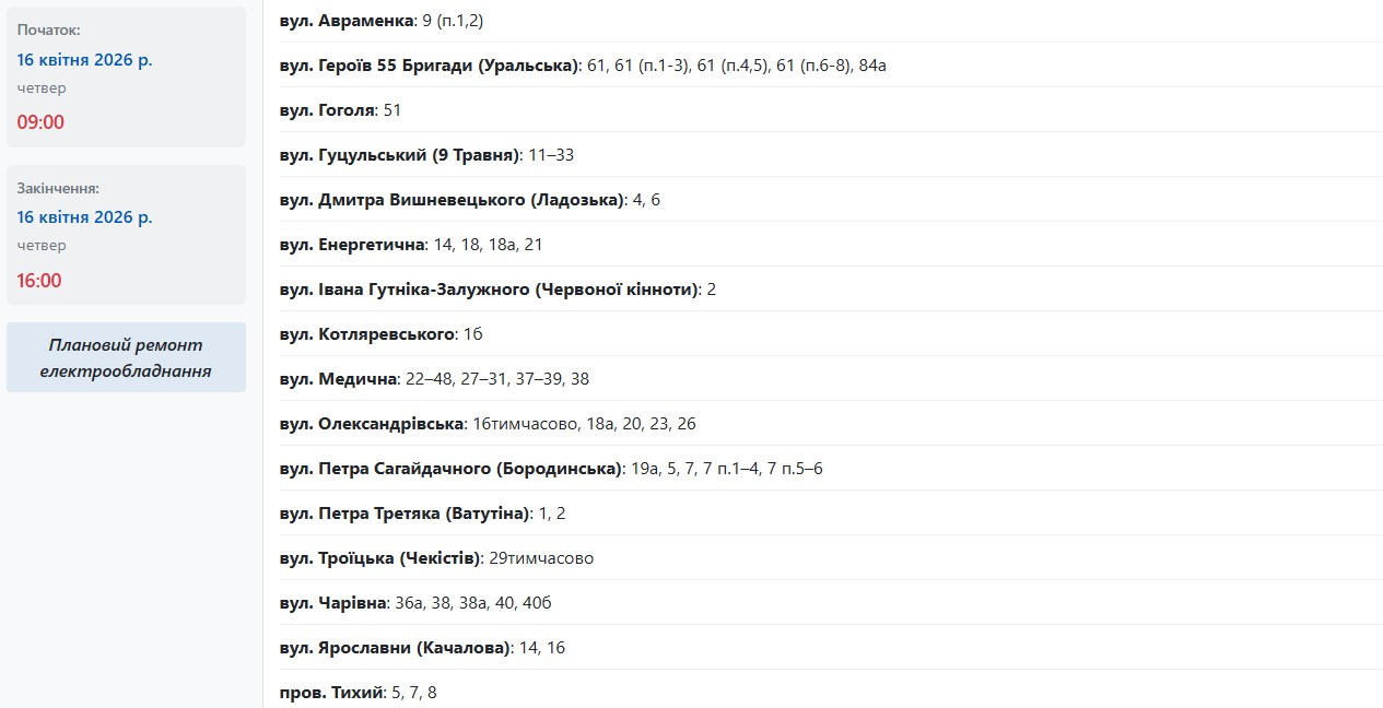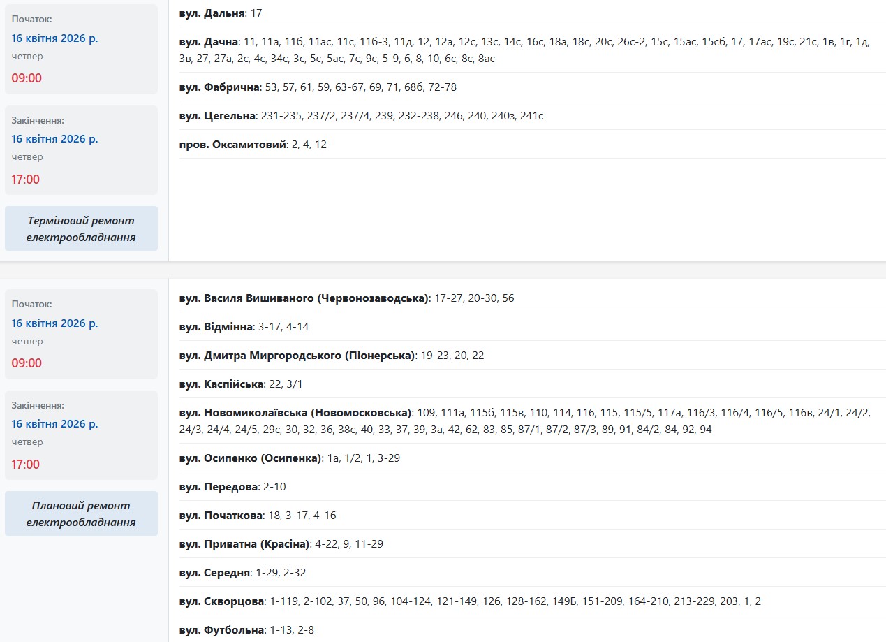 В разных районах Запорожья обесточат более 40 улиц в четверг, 16 апреля. Об этом сообщает АО "Запорожьеоблэнерго", передает "Справжнє".