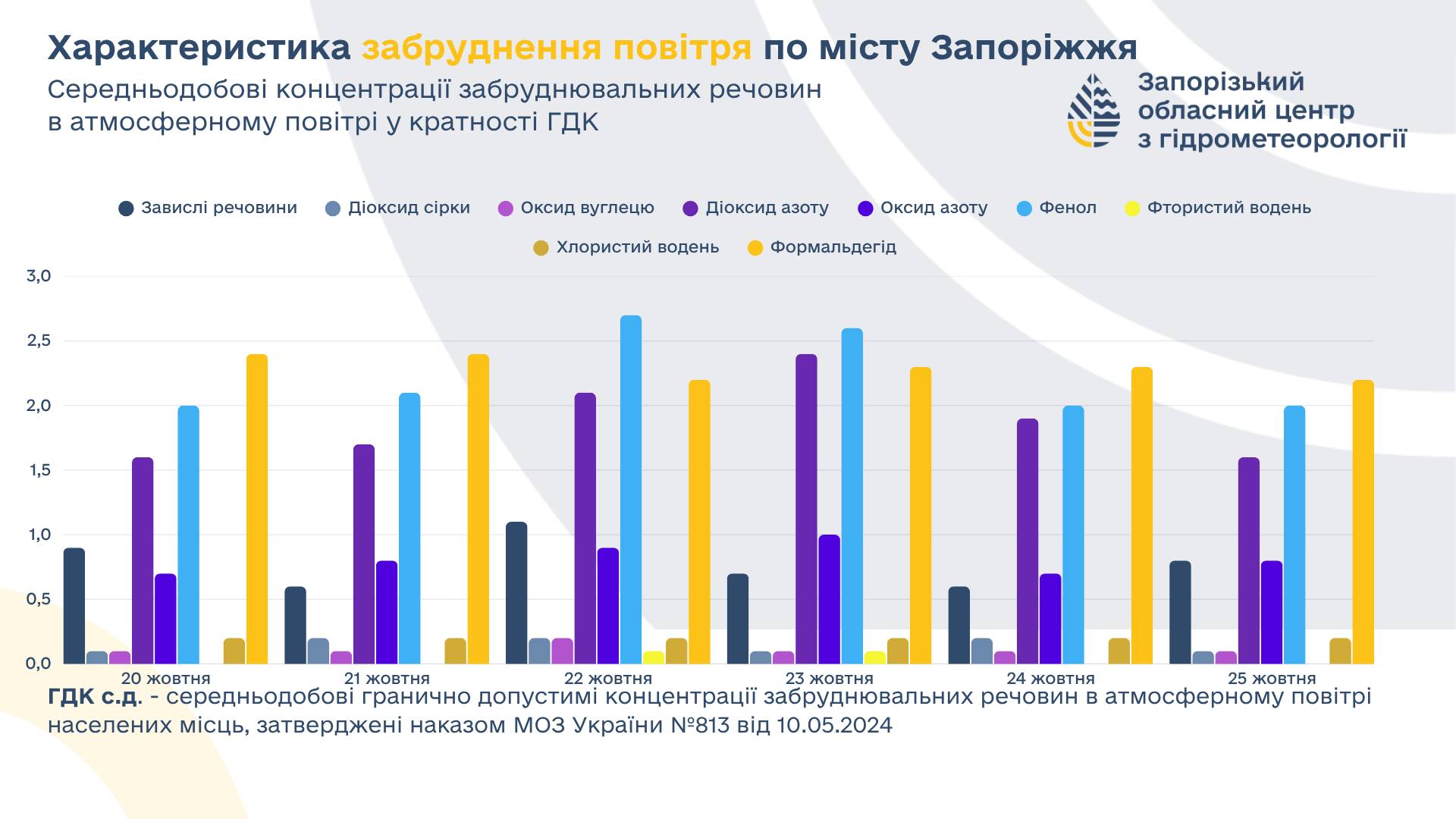 Как показывают результаты исследования, с 20 по 25 октября среднесуточные концентрации загрязняющих веществ в запорожском воздухе были превышены по следующим показателям: