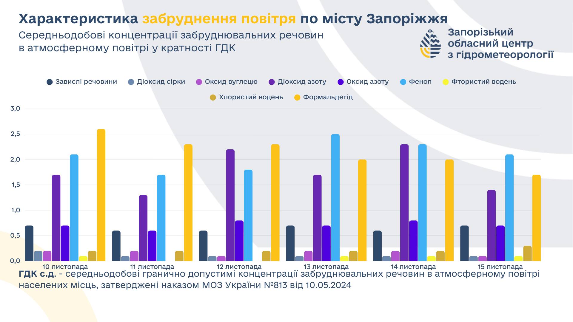 Специалисты выяснили, что на прошлой неделе с 10 по 15 ноября запорожцы дышали воздухом с завышенным содержанием фенола, формальдегида и диоксида азота.