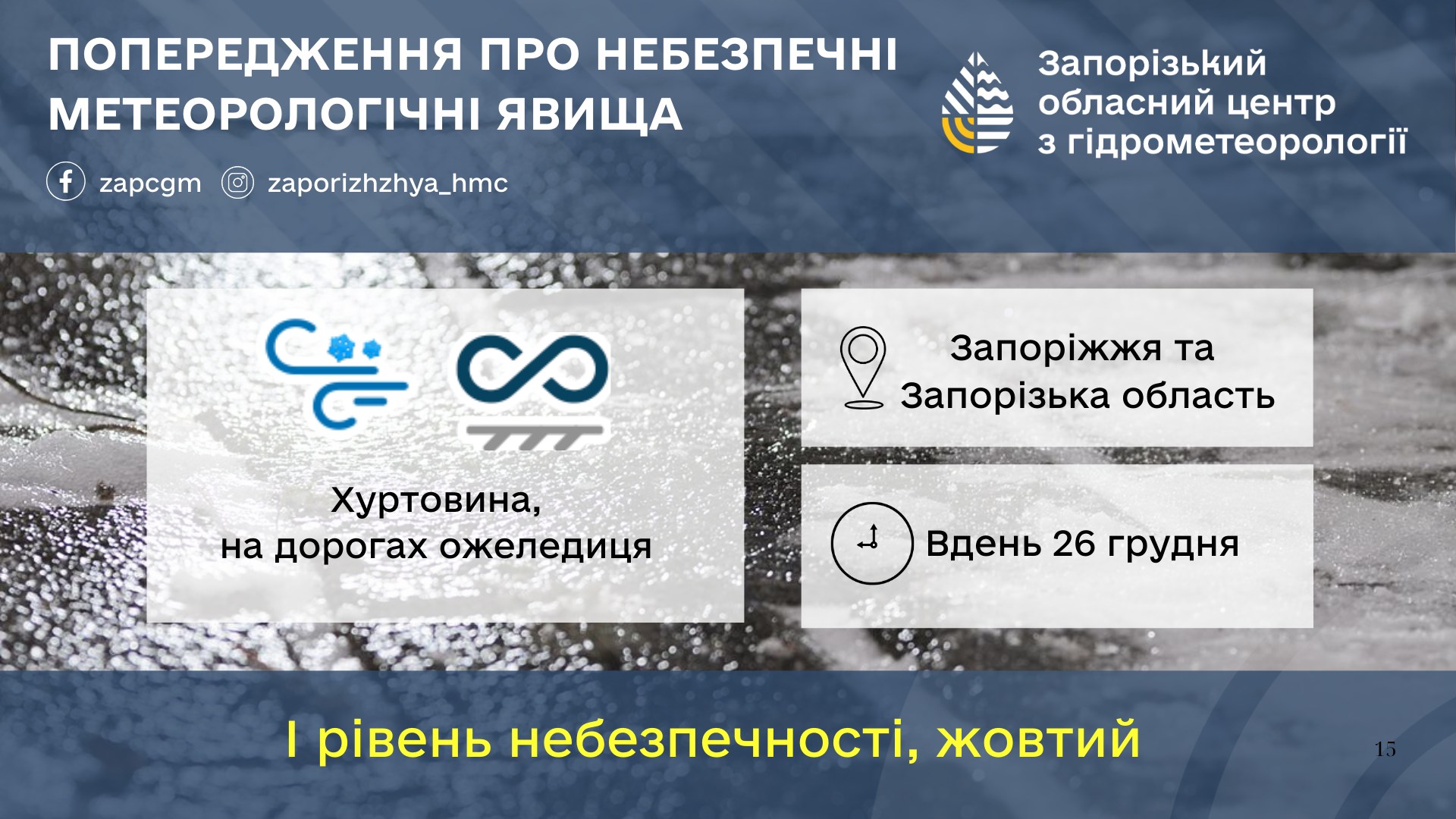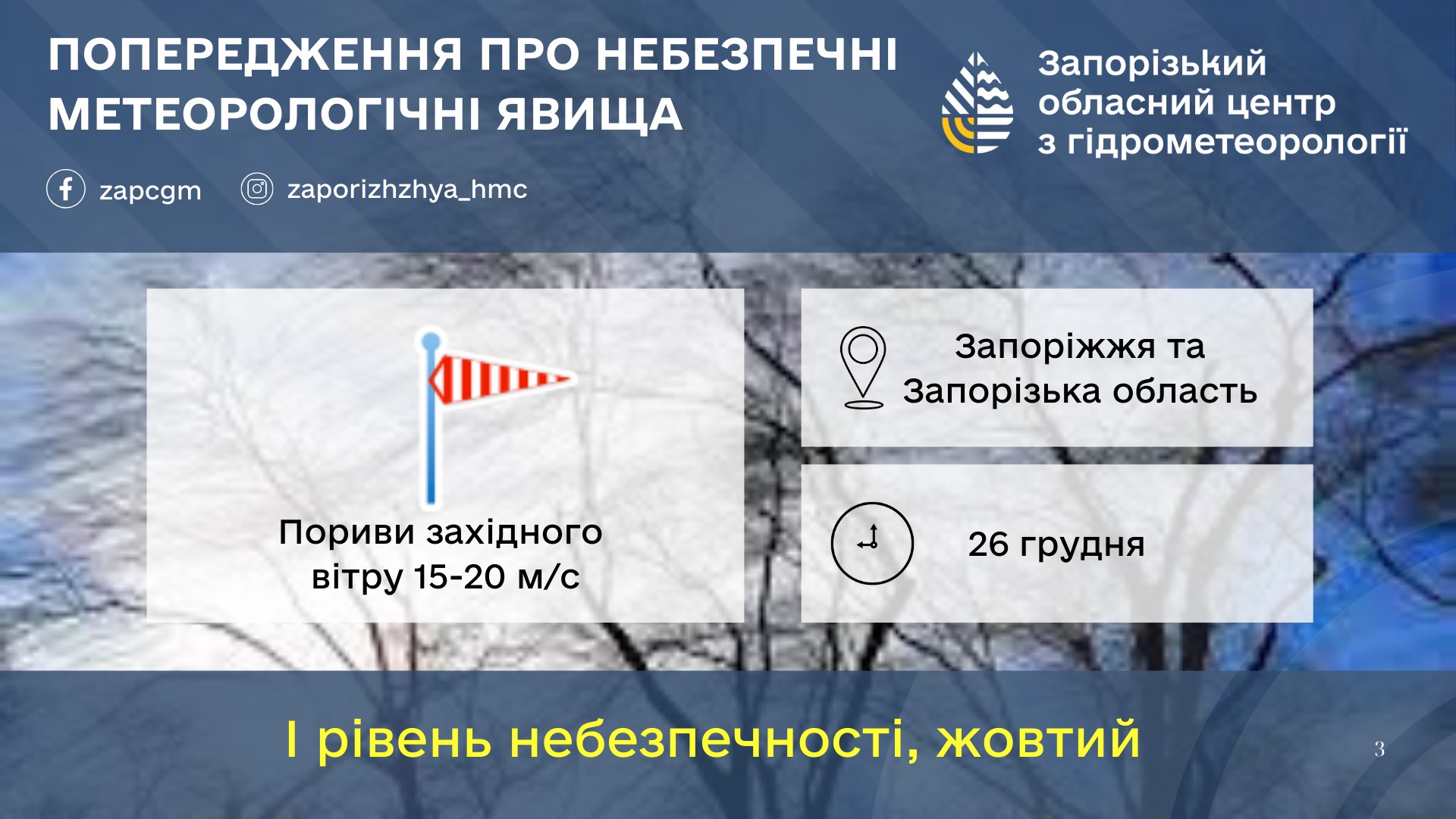 Уже в пятницу, 26 декабря, Запорожье и область могут накрыть метель и сильный ветер. Об этом предупреждают в центре по гидрометеорологии, передает "Справжнє".