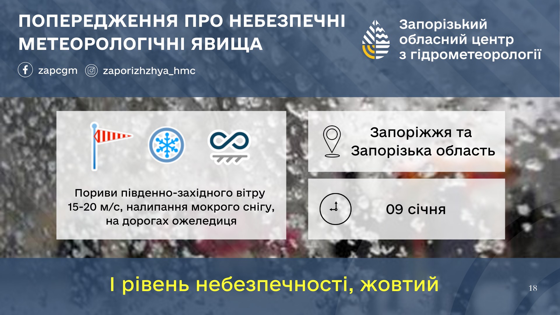 Кроме того, днем 9 января в Запорожье ожидаются штормовой ветер, мокрый снег и сильный гололед. Из-за порывов ветра до 15–20 м/с возможно падение деревьев и рекламных щитов. А из-за налипания мокрого снега на линии электропередач существует риск обрывов и отключений света.