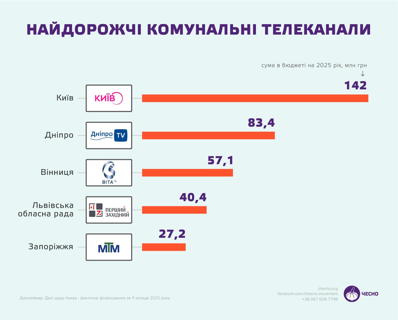 Самым дорогим коммунальным медиа считается столичный телеканал Киев. На его работу в 2025 году направили из бюджета 142 миллиона гривен.