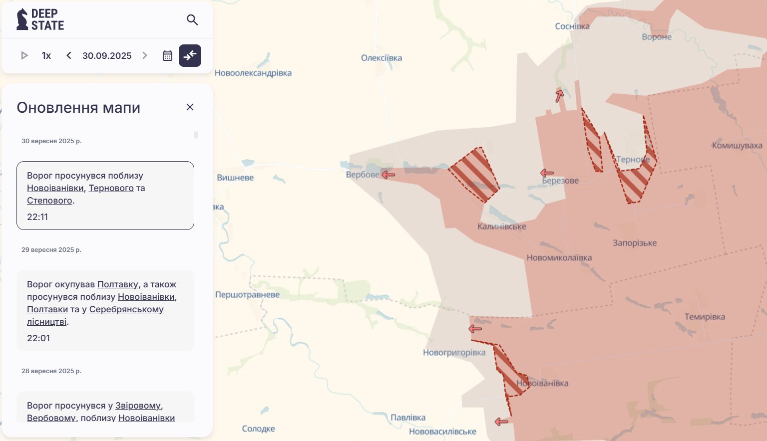 Российская оккупационная армия продолжает движение в районе села Новоивановка (Новопавловское направление) Запорожской области. Обновленную информацию на карте боевых действий в среду, 1 октября, обозначил украинский аналитический проект DeepState, передает "Справжнє".