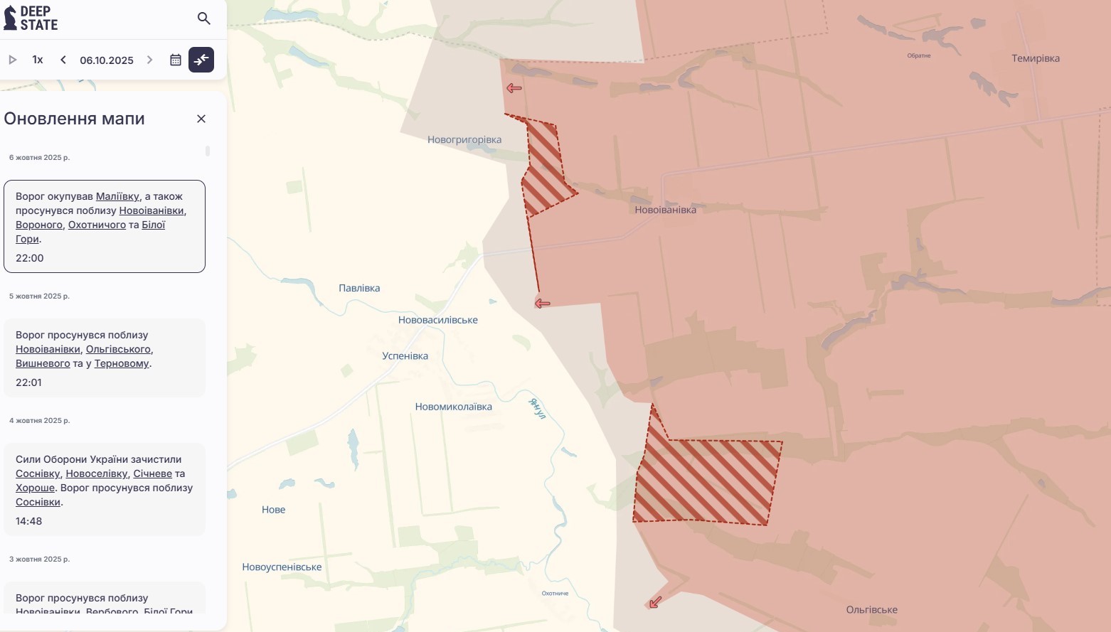 Российские войска продолжили движение в районе Новоивановки (Новопавловское направление) и Охотничьего (Гуляйпольское направление) Пологовского района Запорожской области. Об этом в ночь на вторник, 7 октября, сообщил аналитический проект DeepState, передает "Справжнє".